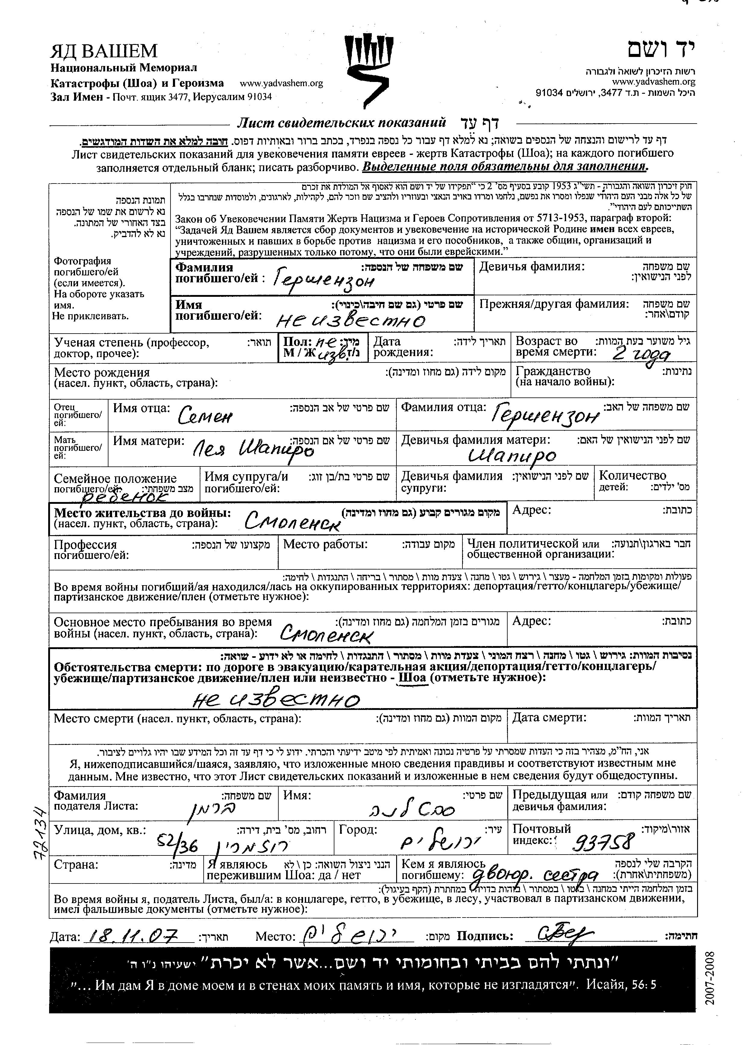 Гершензон Имя неизвестно Смоленск, Россия (СССР) Лист свидетельских показаний
