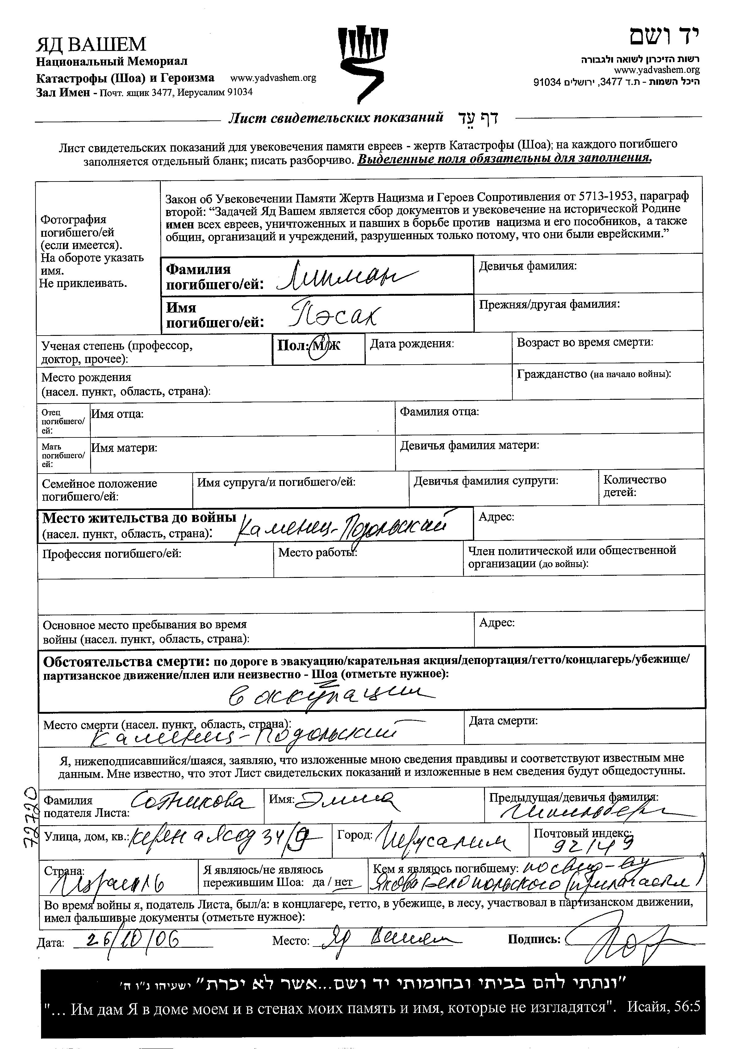 Липман Песах Каменец-Подольский, Украина (СССР) Лист свидетельских показаний