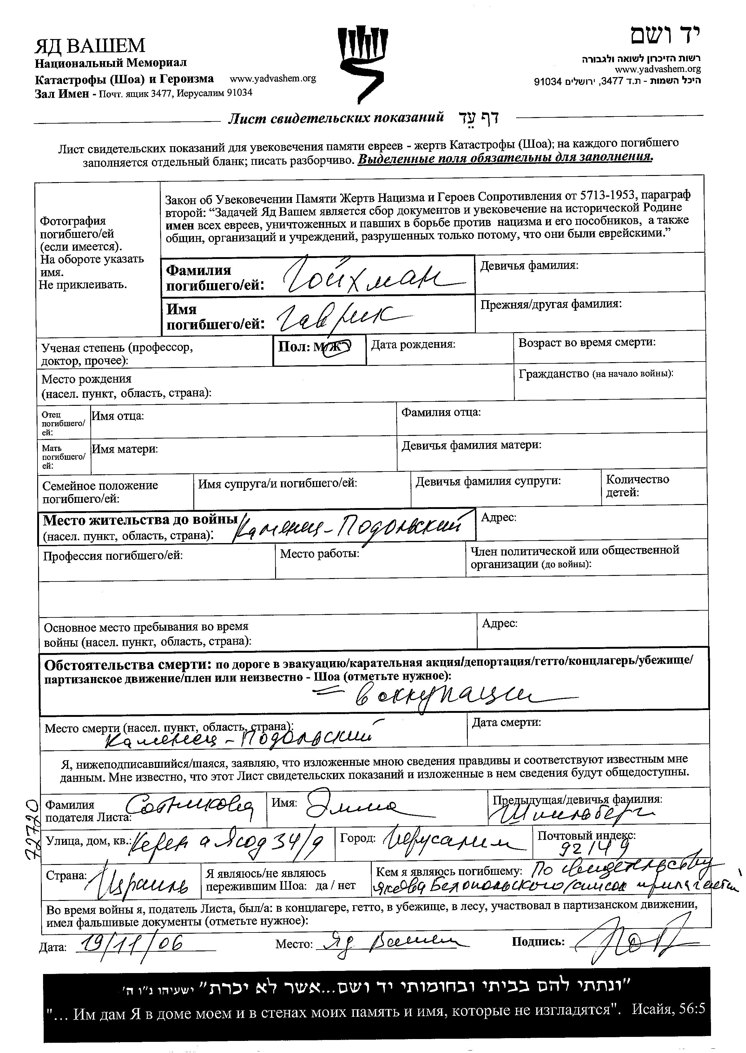 Гойхман Гаврик Каменец-Подольский, Украина (СССР) Лист свидетельских показаний