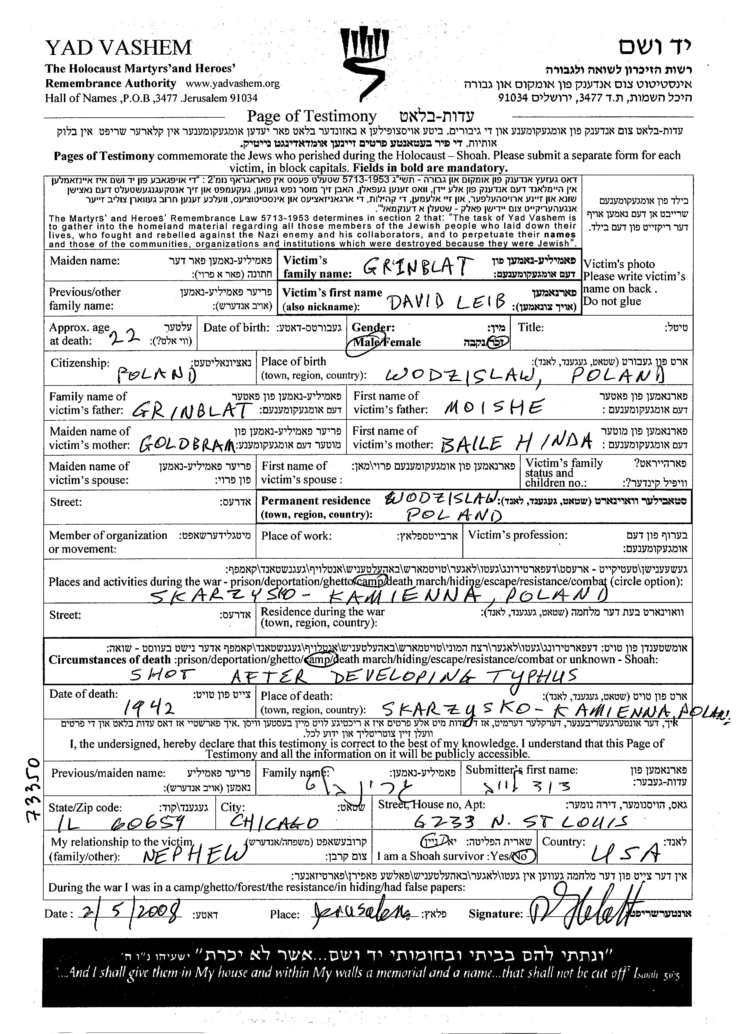 Давид Лейб Гринблат, место рождения: Водзислав, Польша. Отец: Мойше, mать:Байле Хинда, девичья фамилия Гольдбрам. Место жительства до войны: Водзислав, Польша. Место во время войны: Скаржиско-Каменна, Польша.