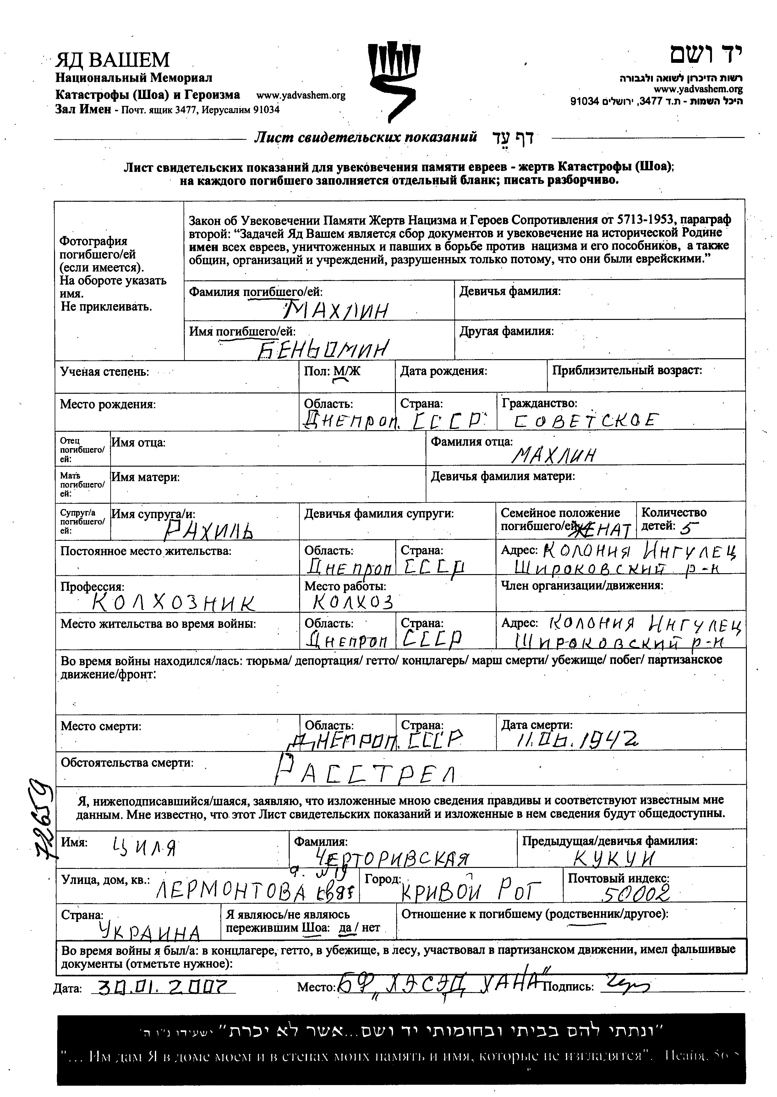 Махлин Беньомин Ingulets town, Украина (СССР) Лист свидетельских показаний