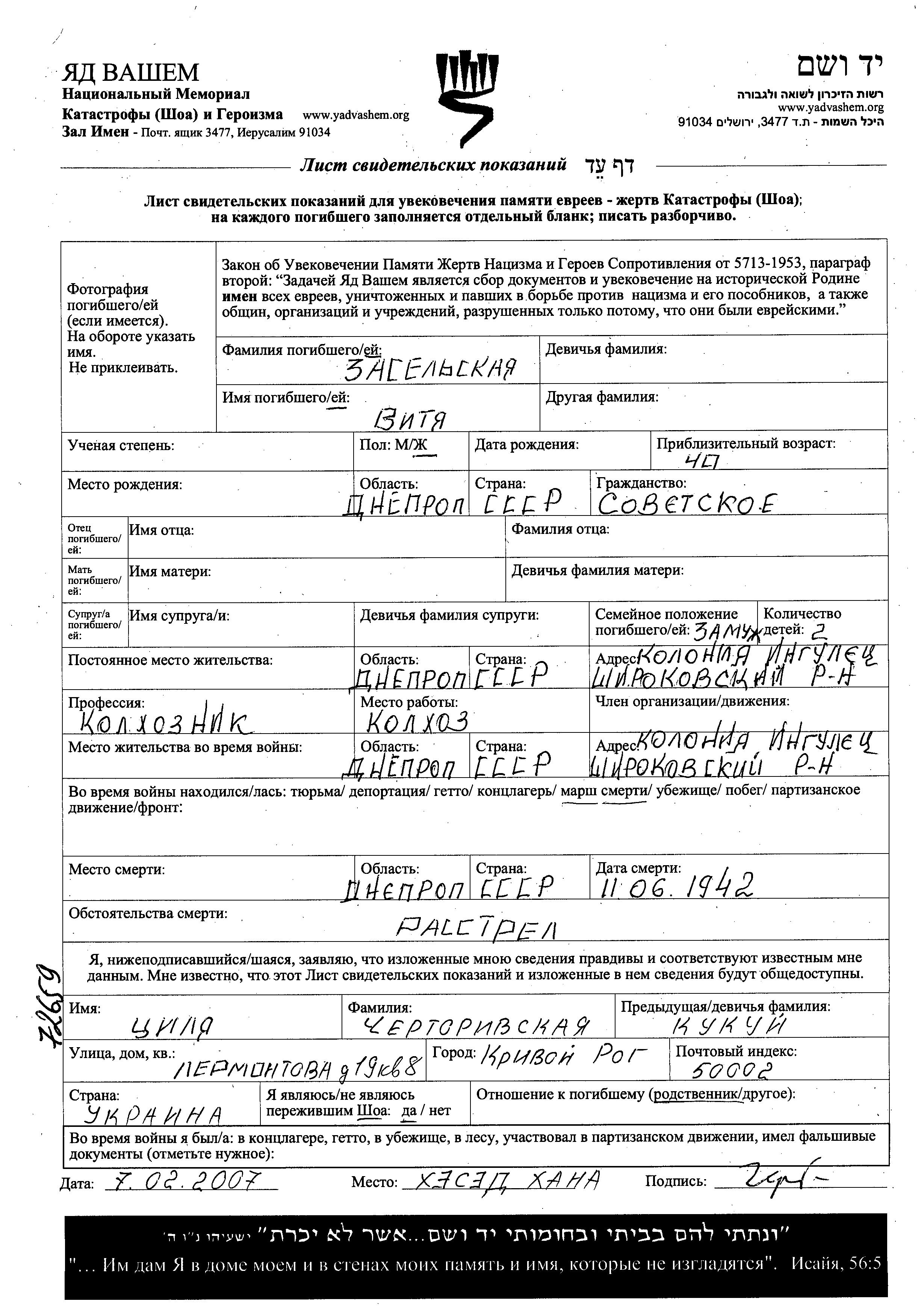 Яд Вашем - Листы свидетельских показаний Мемориального фонда