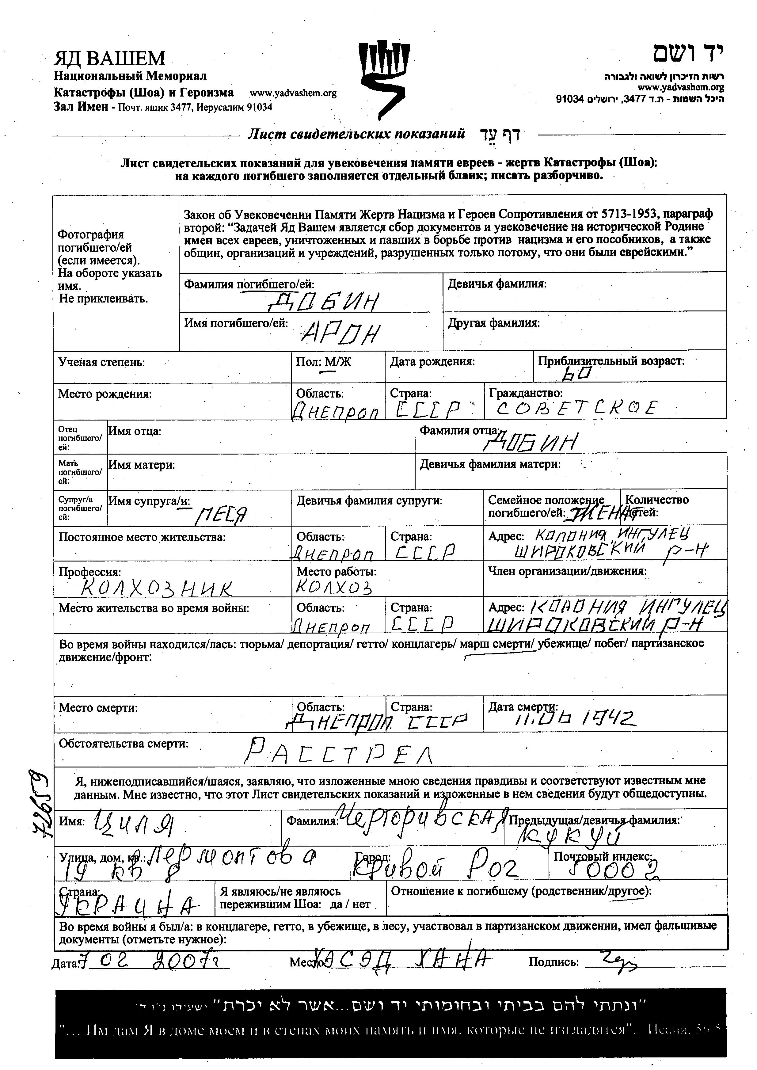 Добин Арон Ingulets town, Украина (СССР) Лист свидетельских показаний