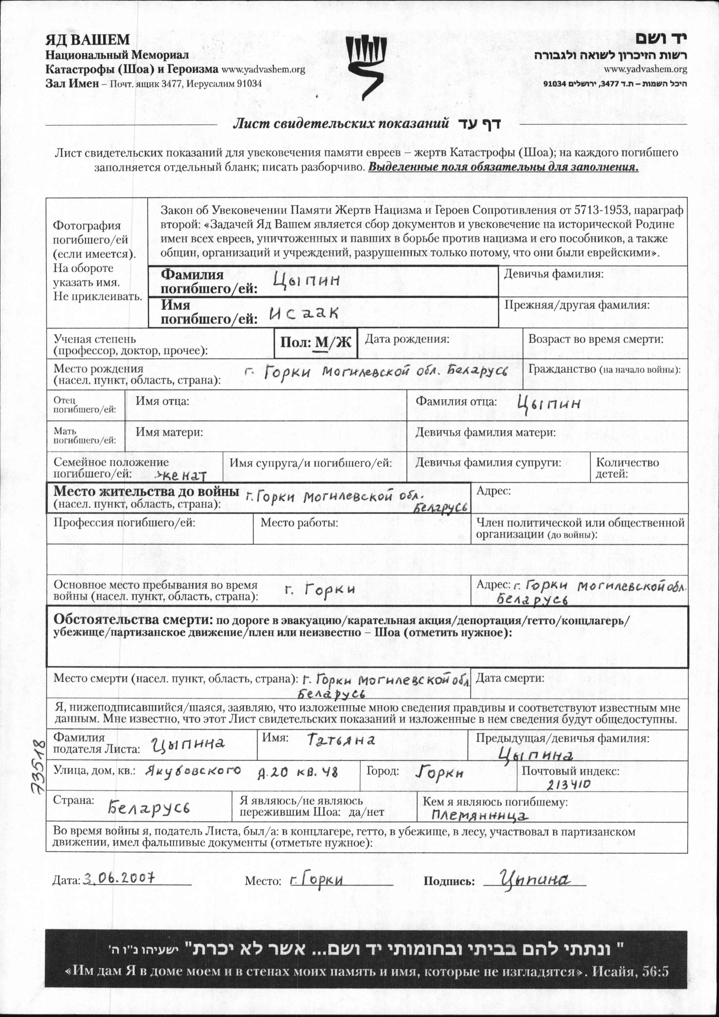 Цыпин Исаак Горки, Белоруссия (СССР) Лист свидетельских показаний