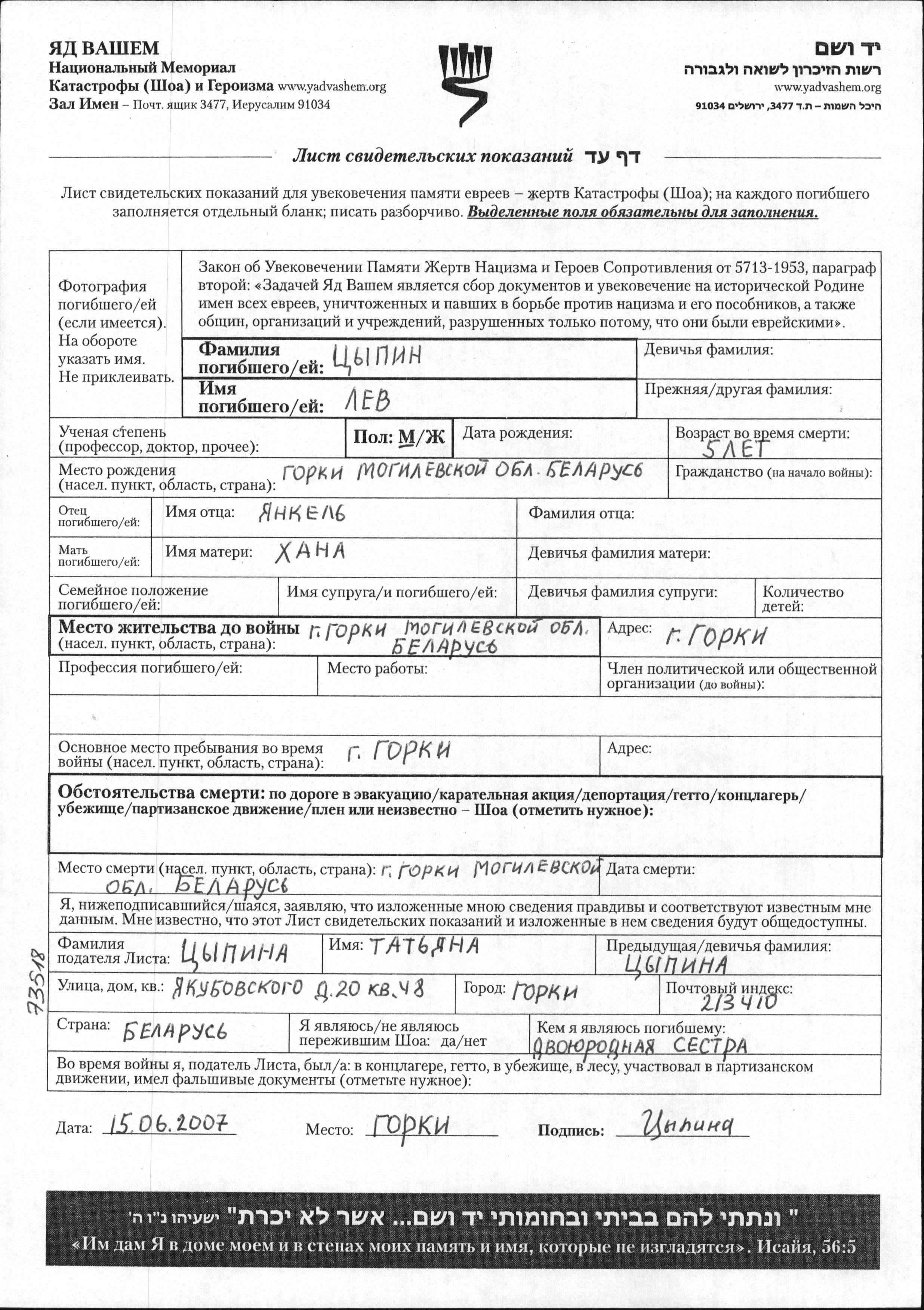 Цыпин Лев Горки, Белоруссия (СССР) Лист свидетельских показаний