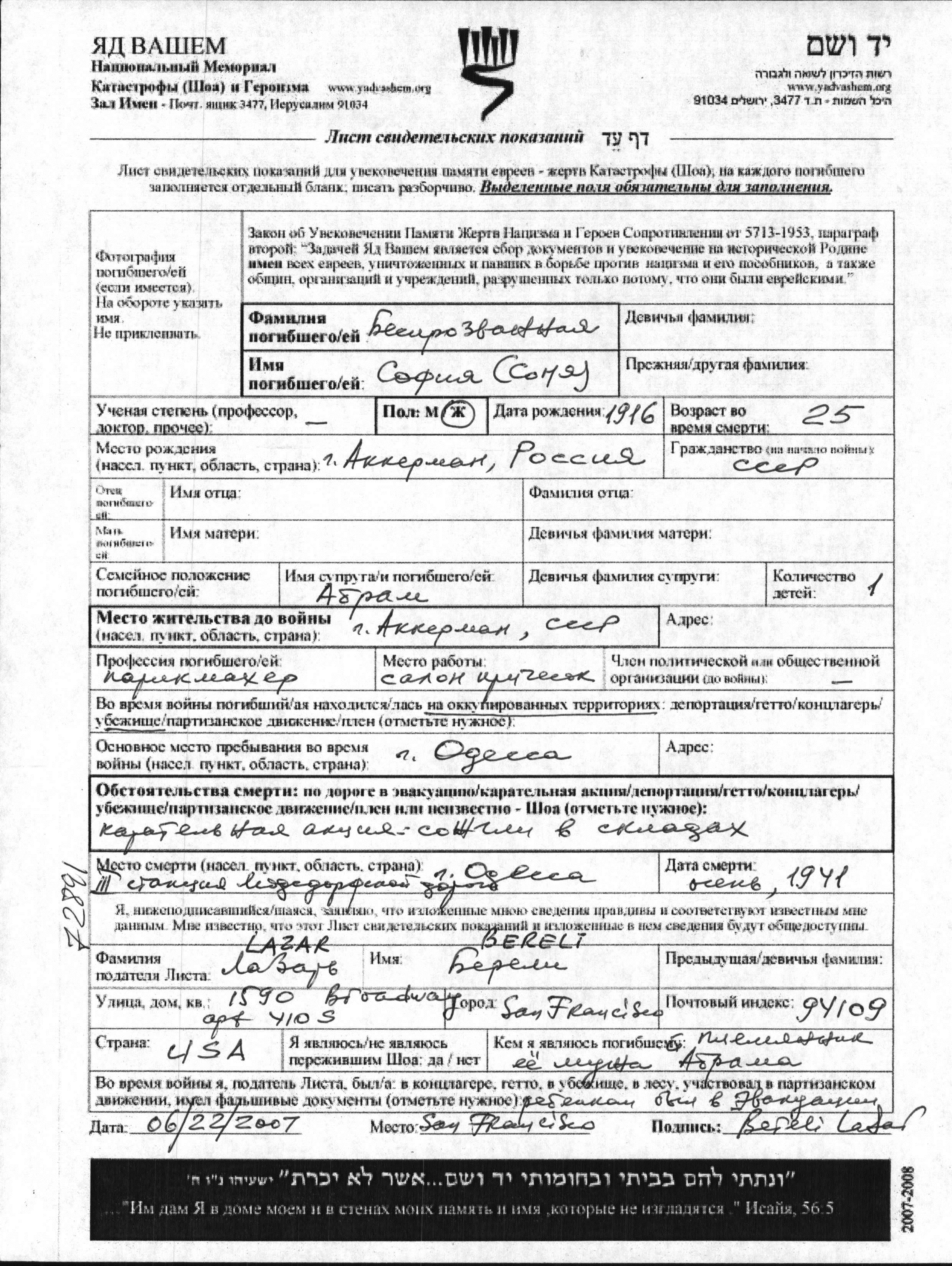 Софья Беспрозванная, место рождения: Аккерман, Румыния. Парикмахер. Женат / замужем. Место жительства до войны: Аккерман, Румыния. Место во время войны: Одесса, Украина (СССР).