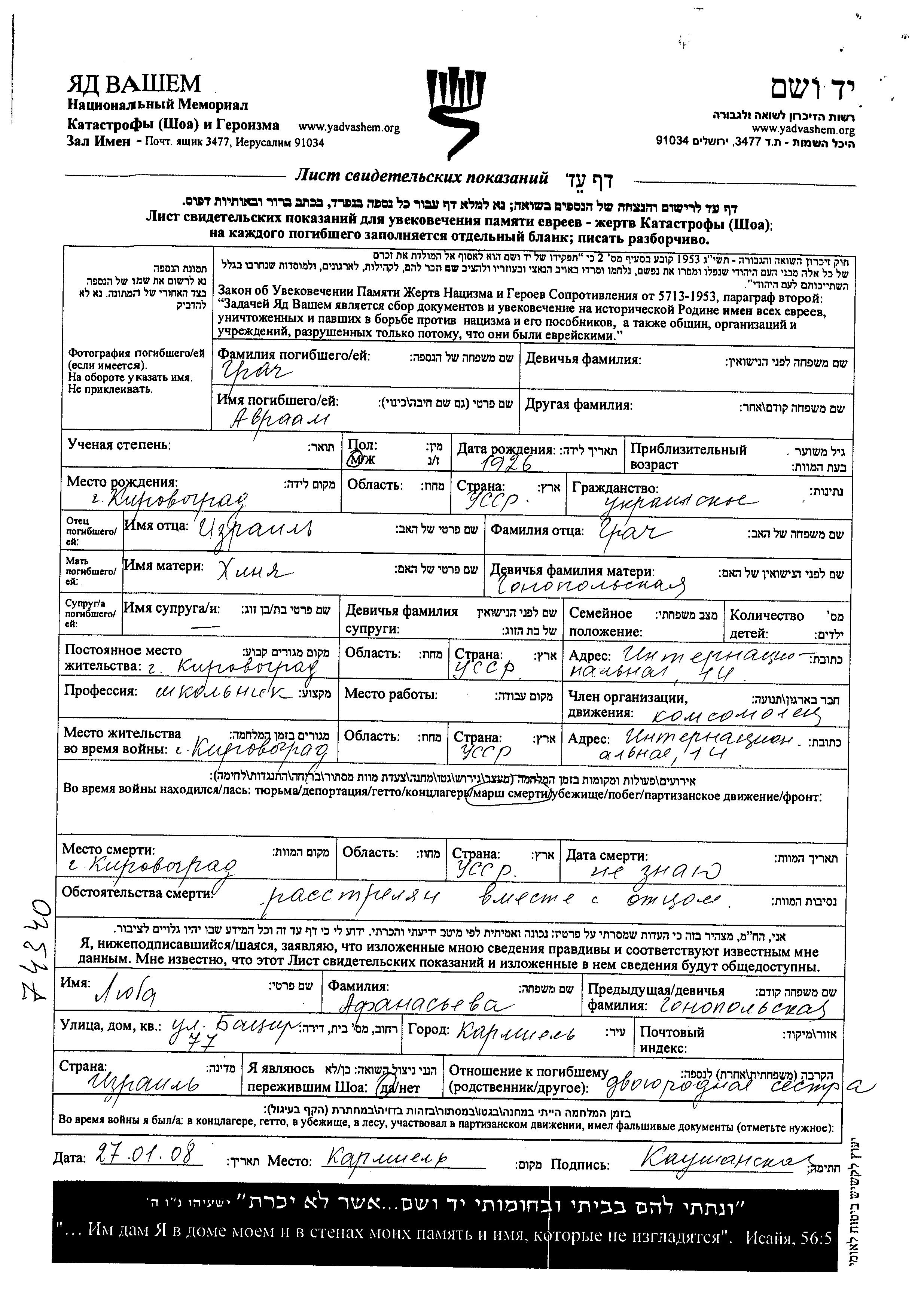 Грах Авраам 1926 Кировоград, Украина (СССР) Лист свидетельских показаний