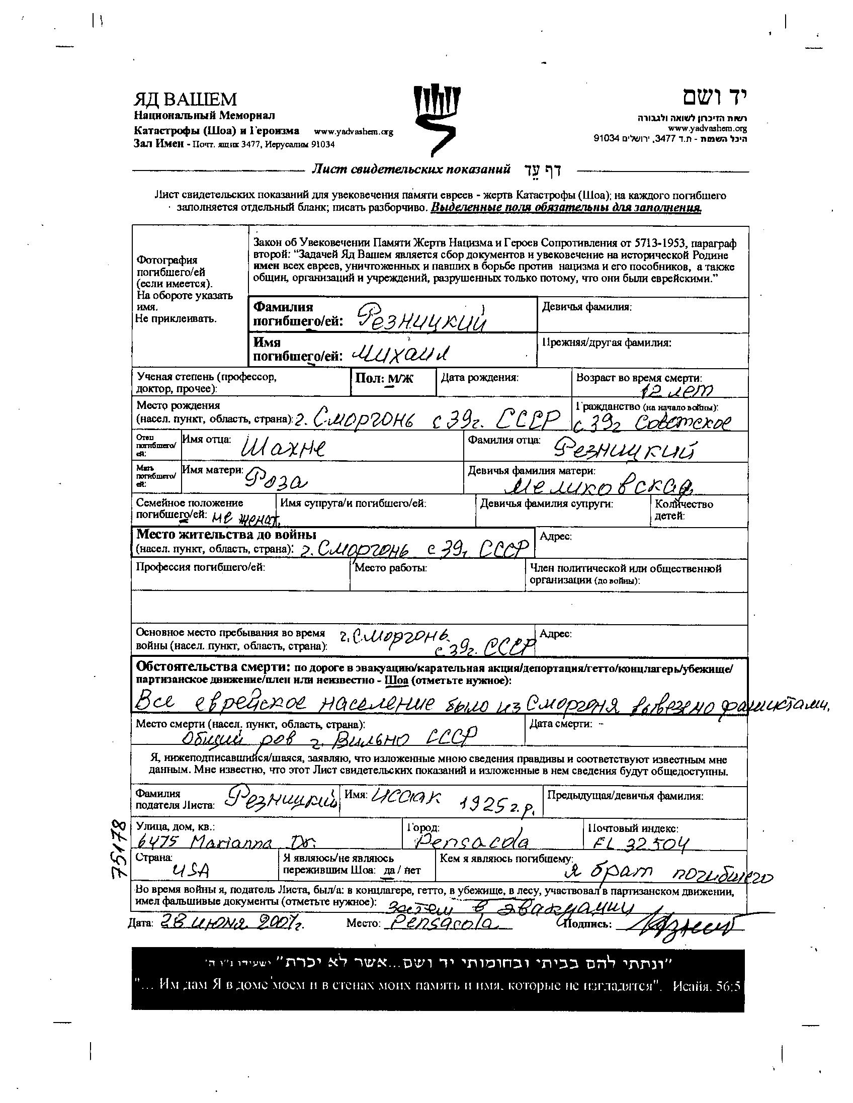 Яд Вашем - Листы свидетельских показаний Мемориального фонда