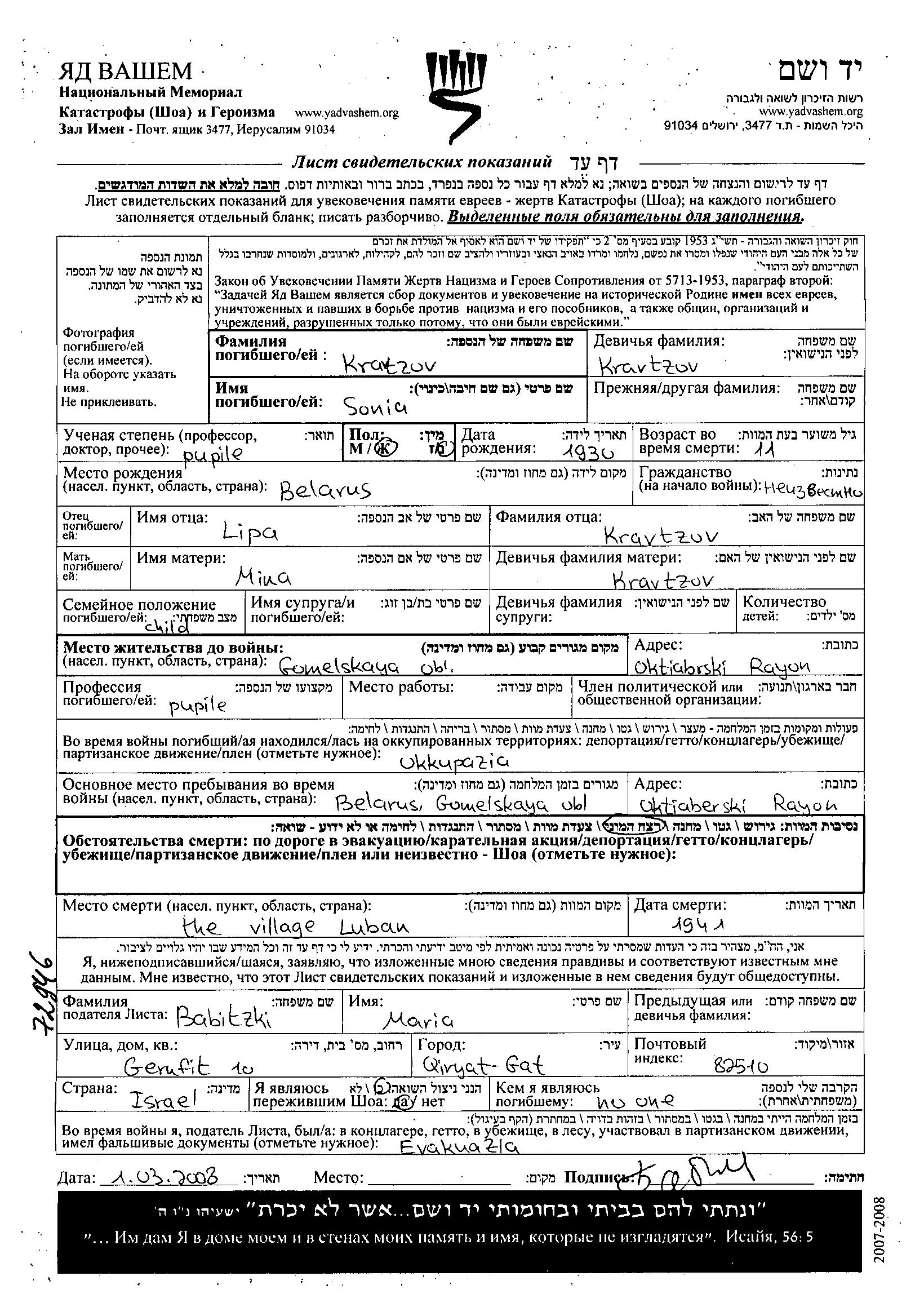 Кравцов Соня 1930 Белоруссия (СССР) Лист свидетельских показаний