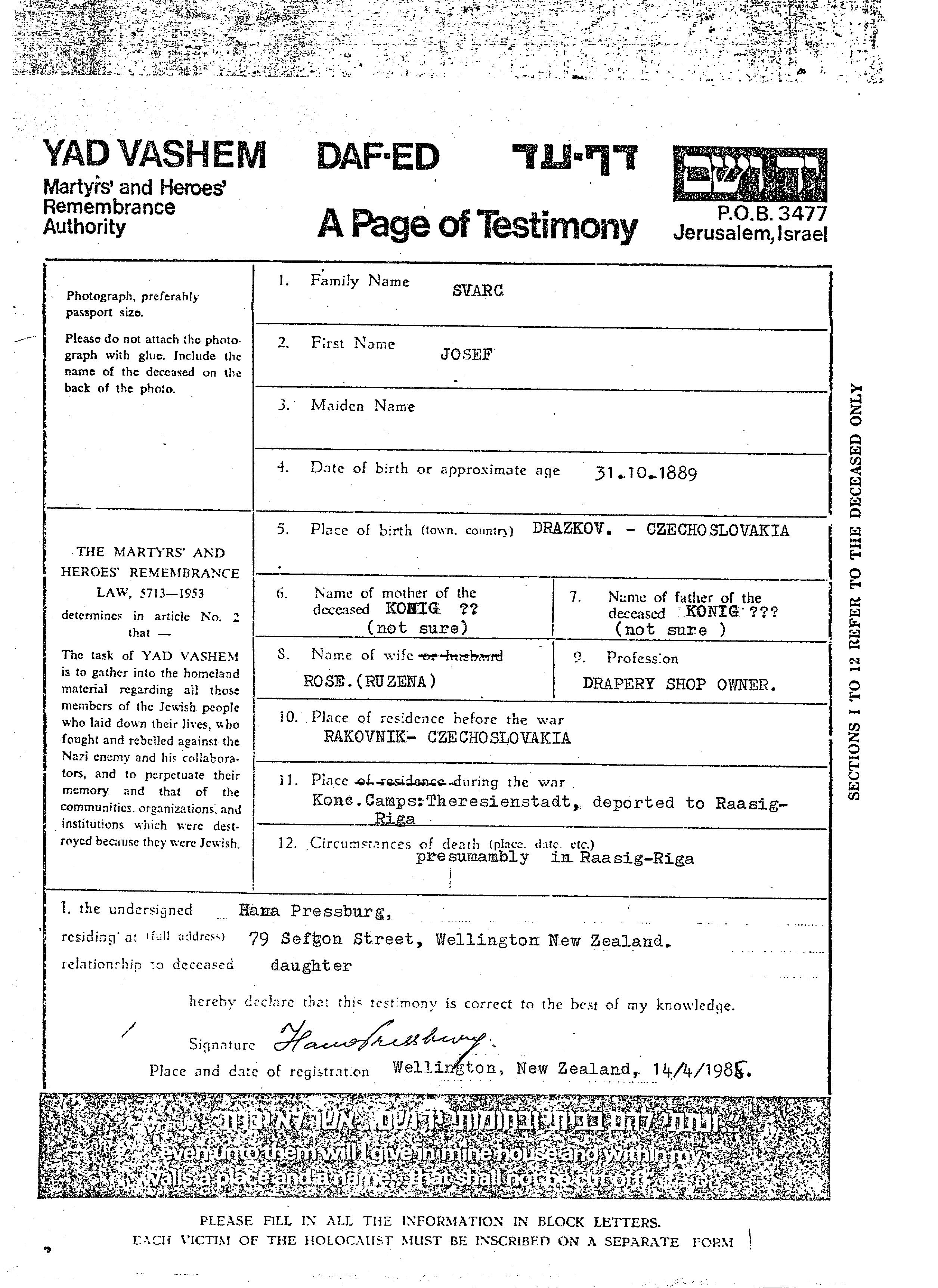 Шварц Йосеф 1889 Раковник, Чехословакия Лист свидетельских показаний