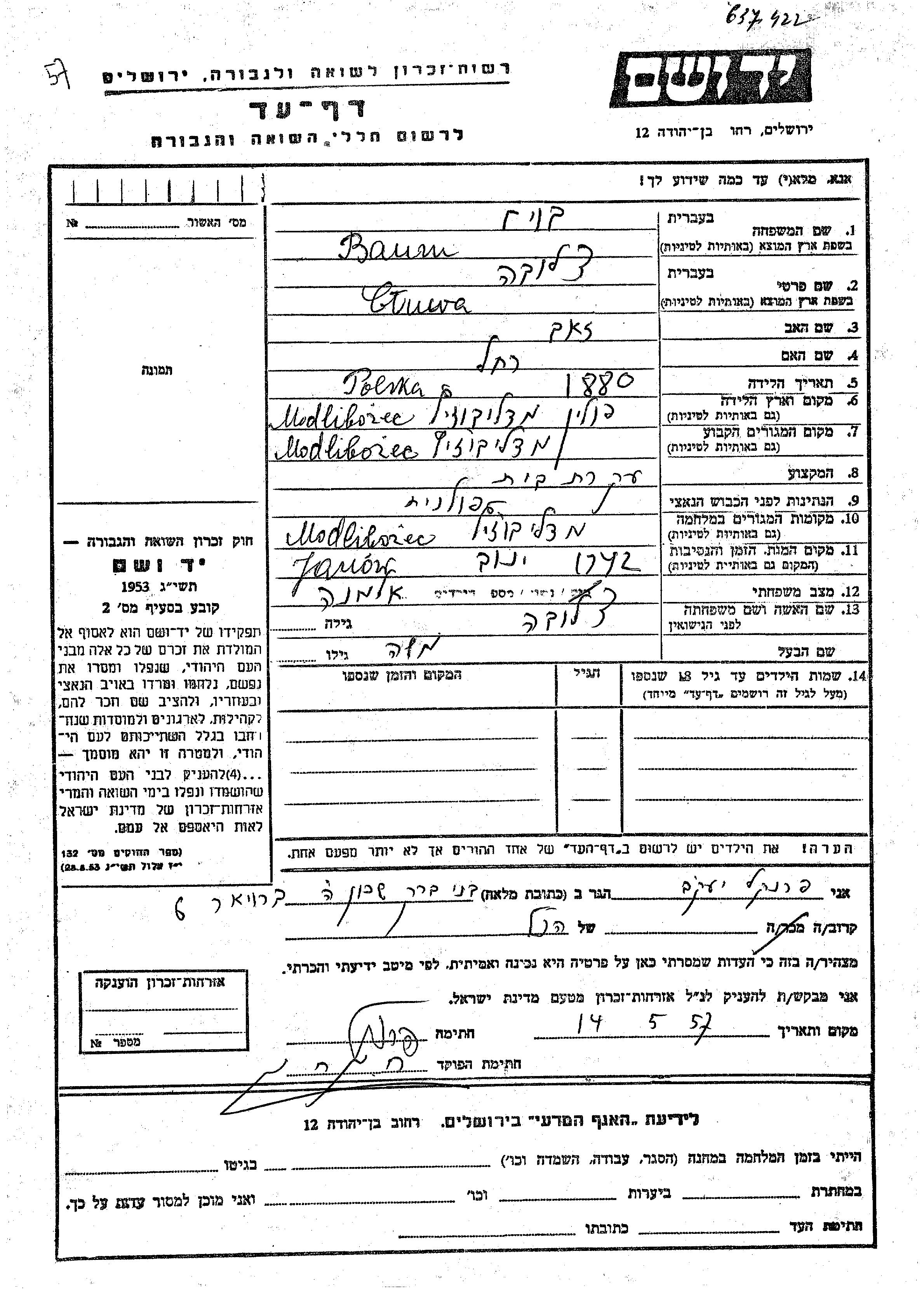 Цлува Баум, место рождения: Модлибожице, Польша. Отец: Зеев, mать:Рахель. Домохозяйка. Вдова. Место жительства до войны: Модлибожице, Польша. Место во время войны: Модлибожице, Польша.