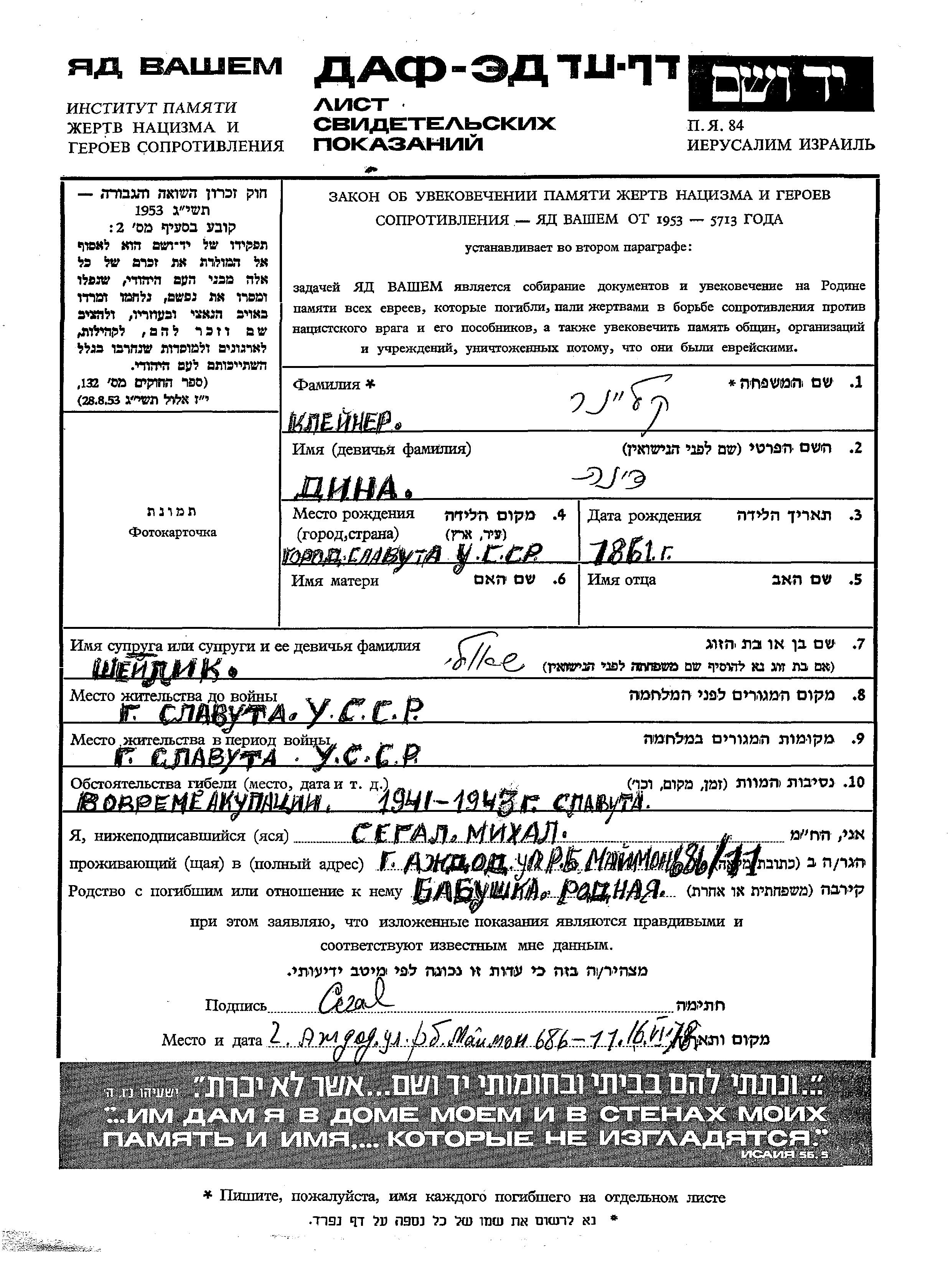 Клейнер Дина 1861 Славута, Украина (СССР) Лист свидетельских показаний