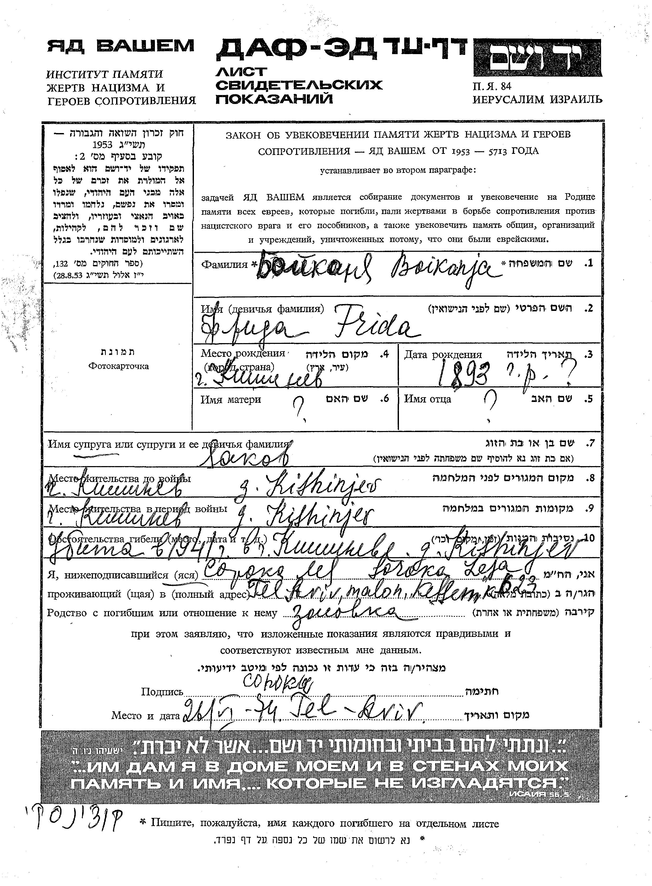 Бойканя Фрида 1893 Кишинёв, Румыния Лист свидетельских показаний