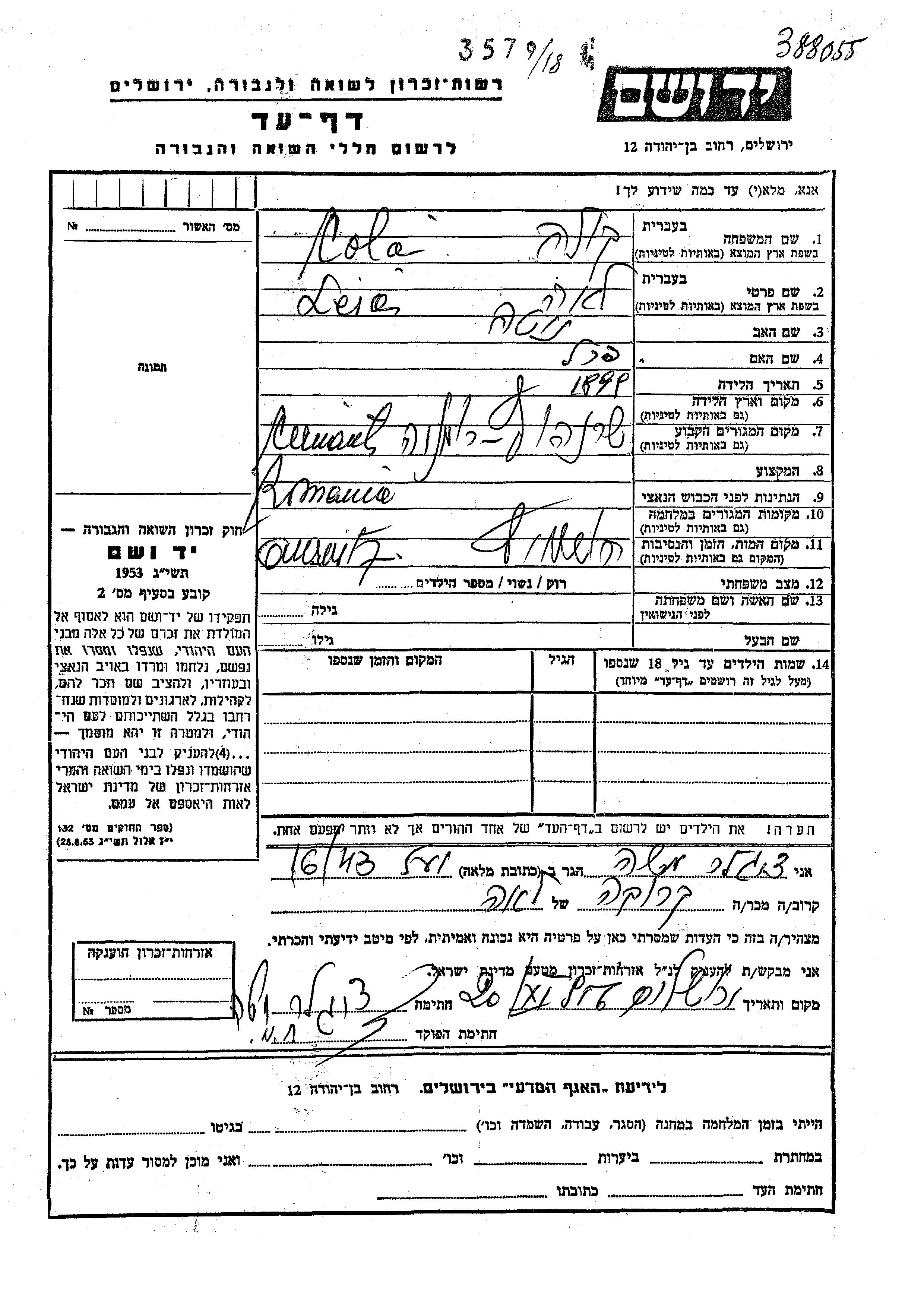 Лея Кола. Отец: Нута, mать:Перел. Место жительства до войны: Черновцы, Румыния.
