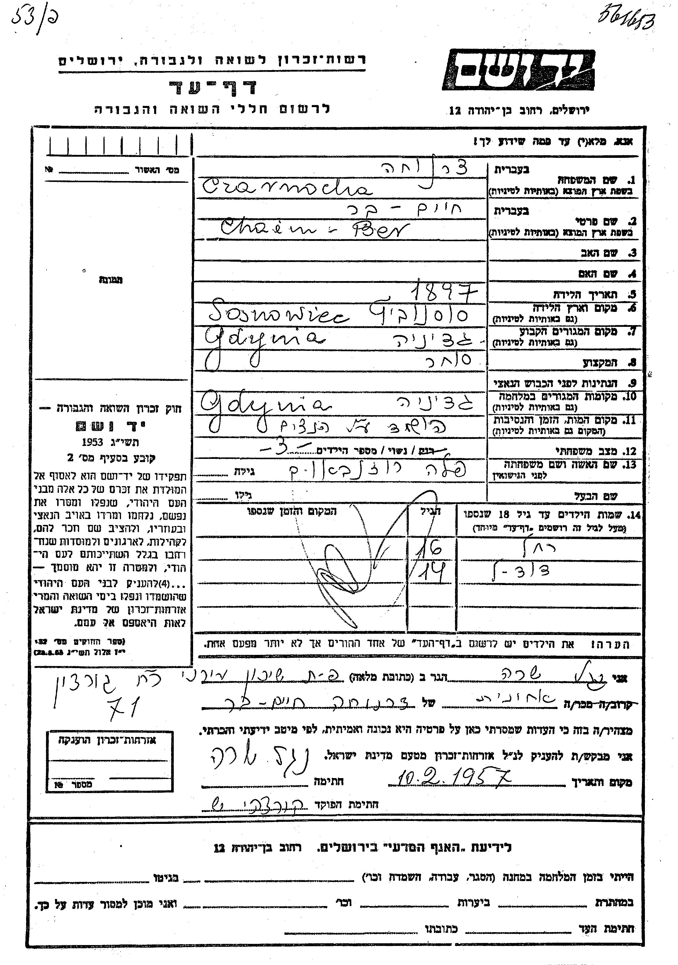 Хаим Бер Чарноха, место рождения: Сосновец, Польша. Торговец / торговка. Женат / замужем. Место жительства до войны: Гдыня, Польша. Место во время войны: Гдыня, Польша.