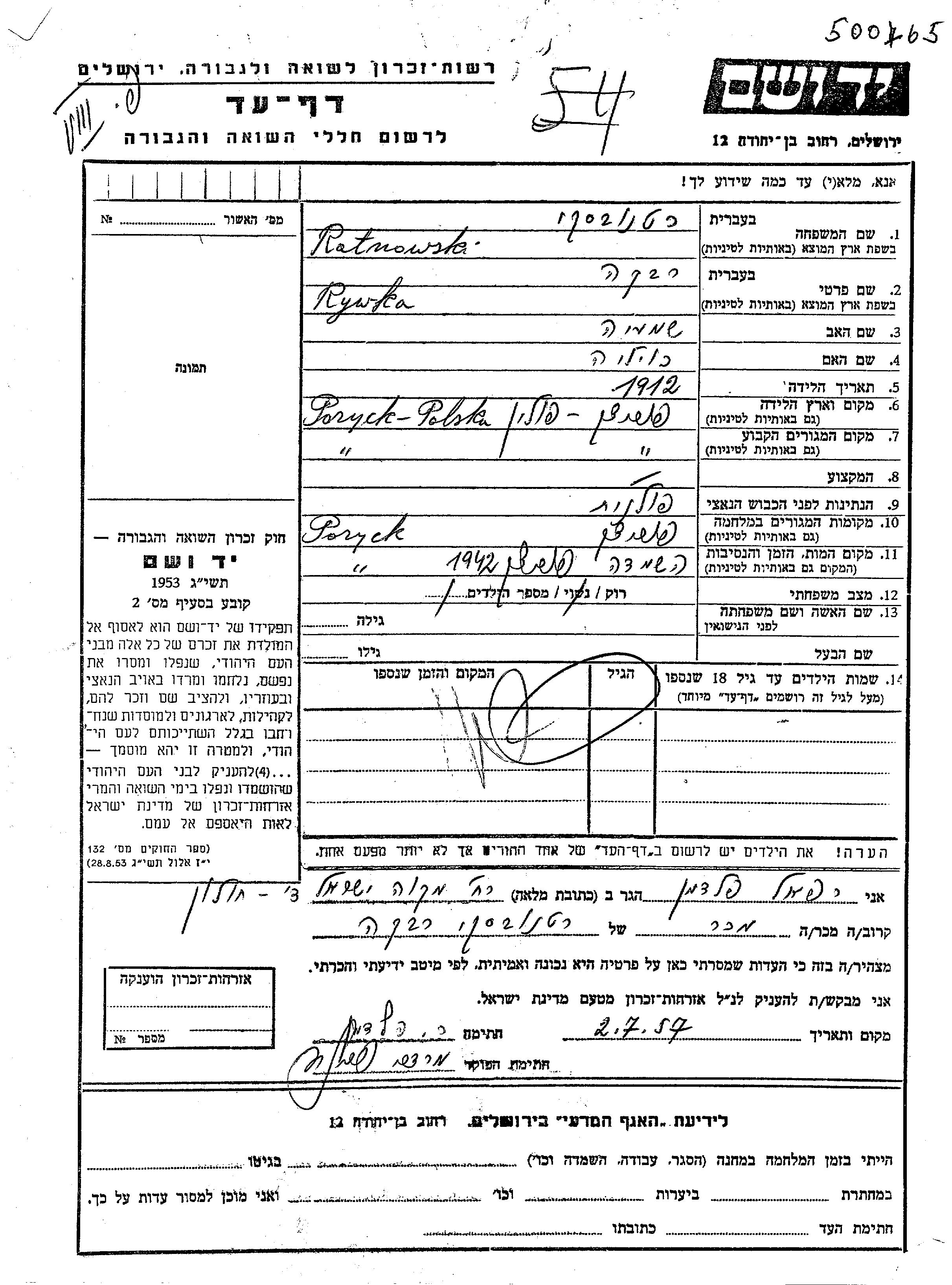 Рывка Ратновски, место рождения: Порицк, Польша. Отец: Шемая. Холост / не замужем. Место жительства до войны: Порицк, Польша. Место во время войны: Порицк, Польша.