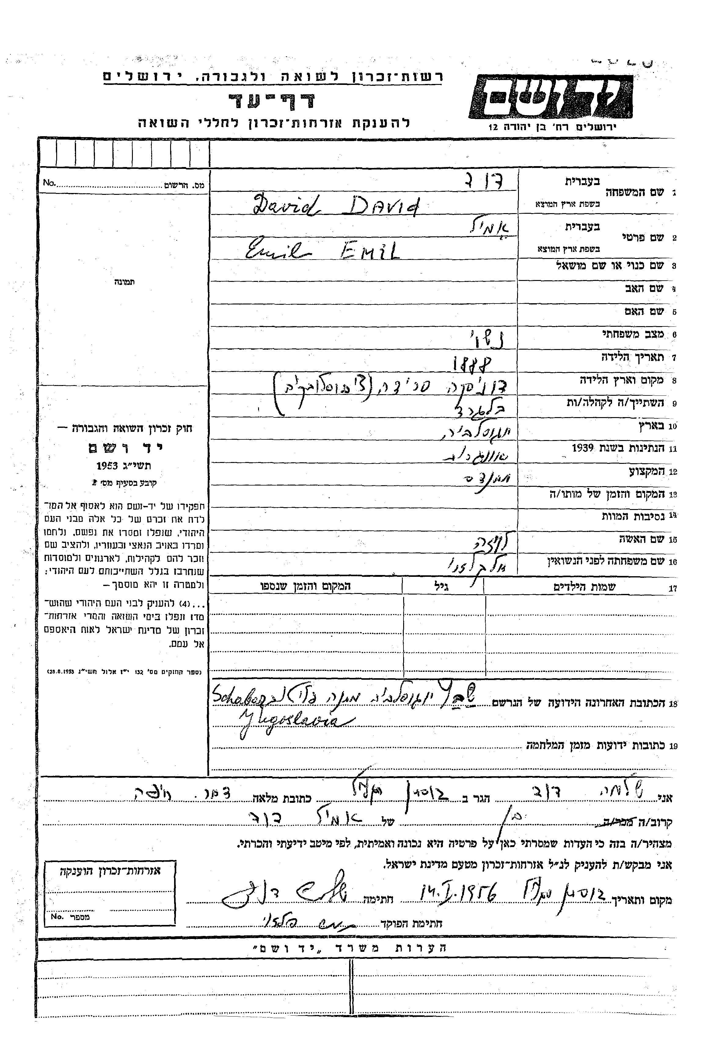 Давид Эмиль 1888 Белград, Югославия Лист свидетельских показаний