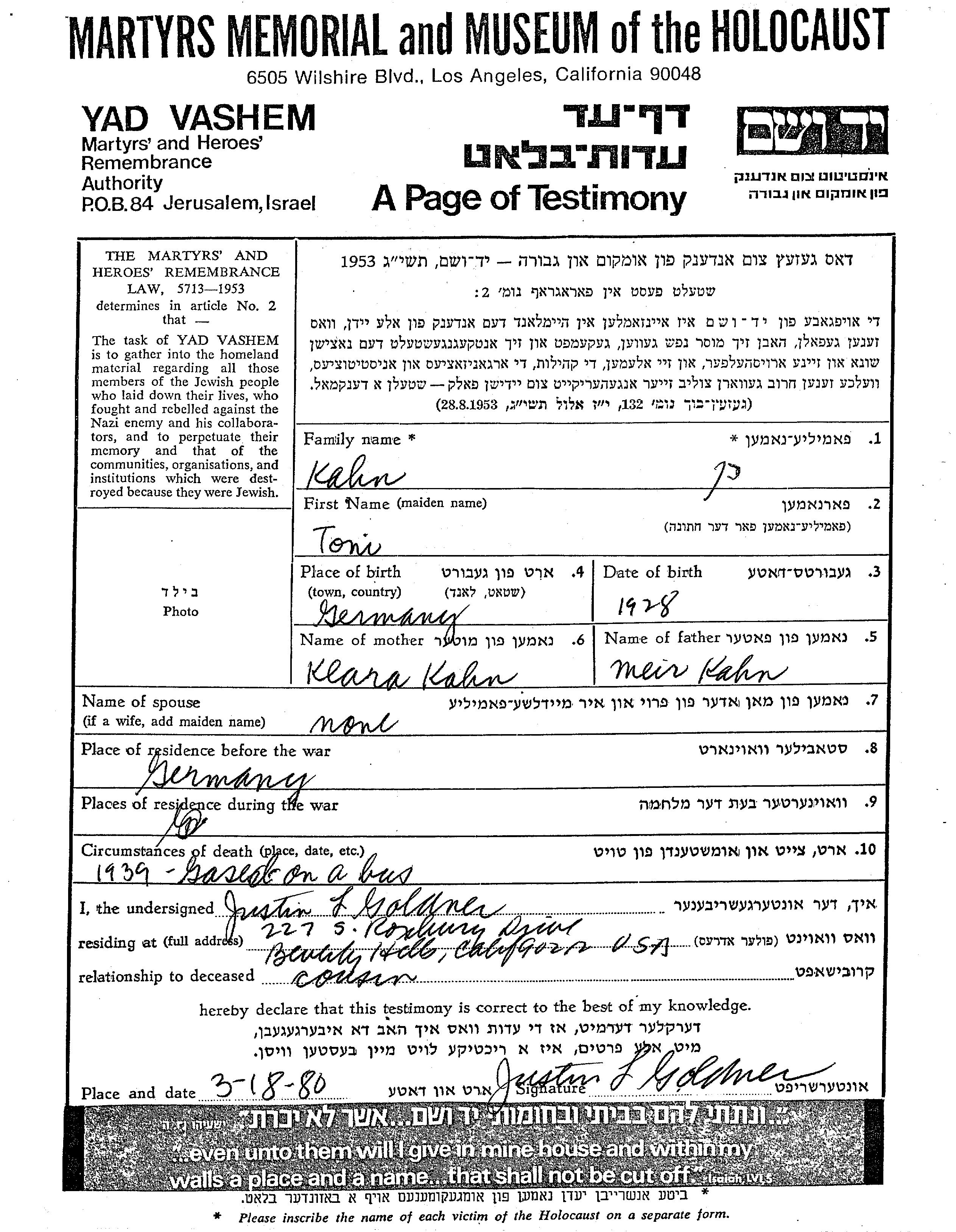 Тони Кан, место рождения: Германия. Отец: Меир, mать:Клара. Место жительства до войны: Германия.
