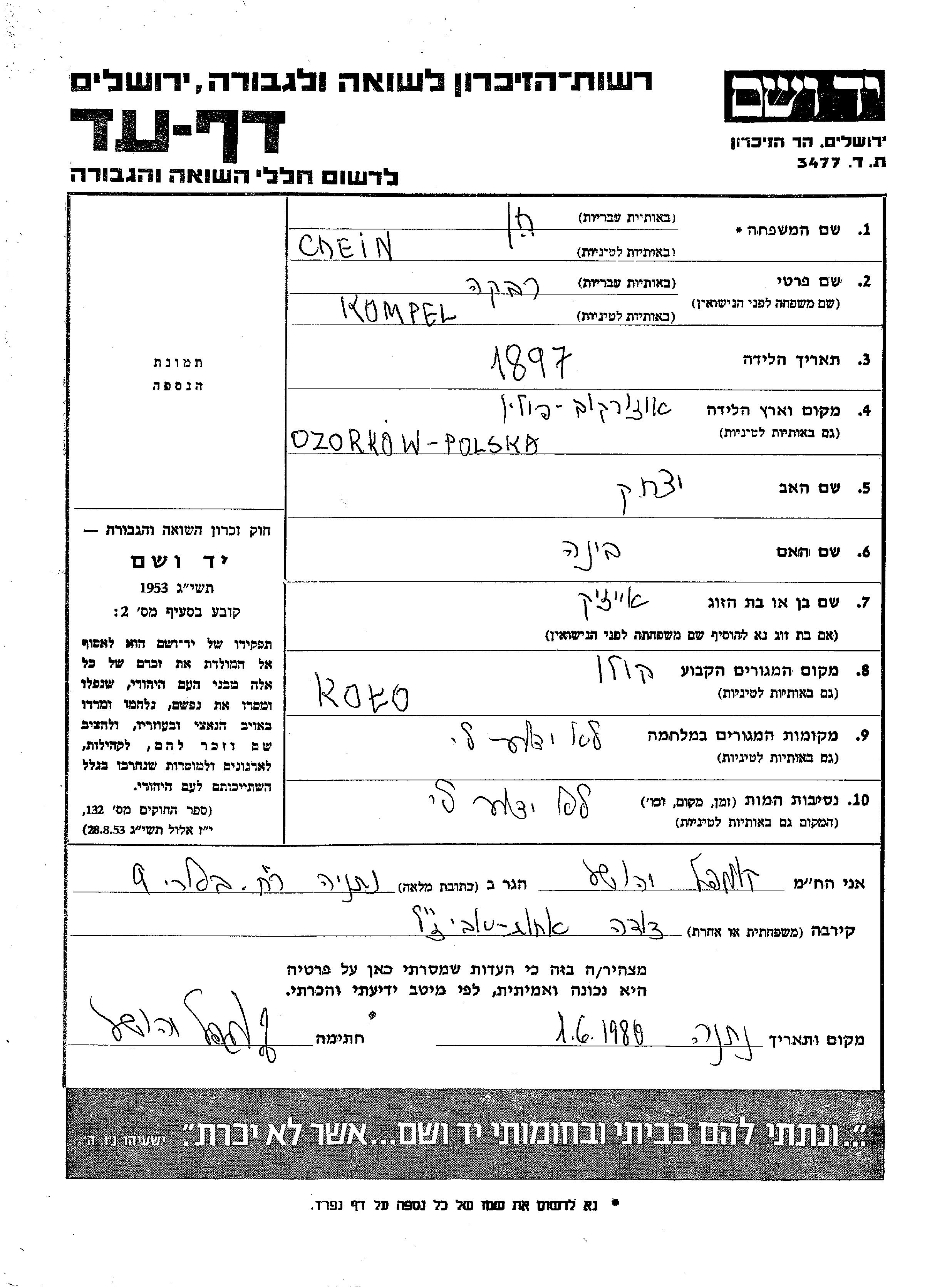Ривка Хейн Хан, девичья фамилия Компель, место рождения: Озоркув, Польша. Отец: Ицхак, mать:Бина. Женат / замужем. Место жительства до войны: Коло, Польша.