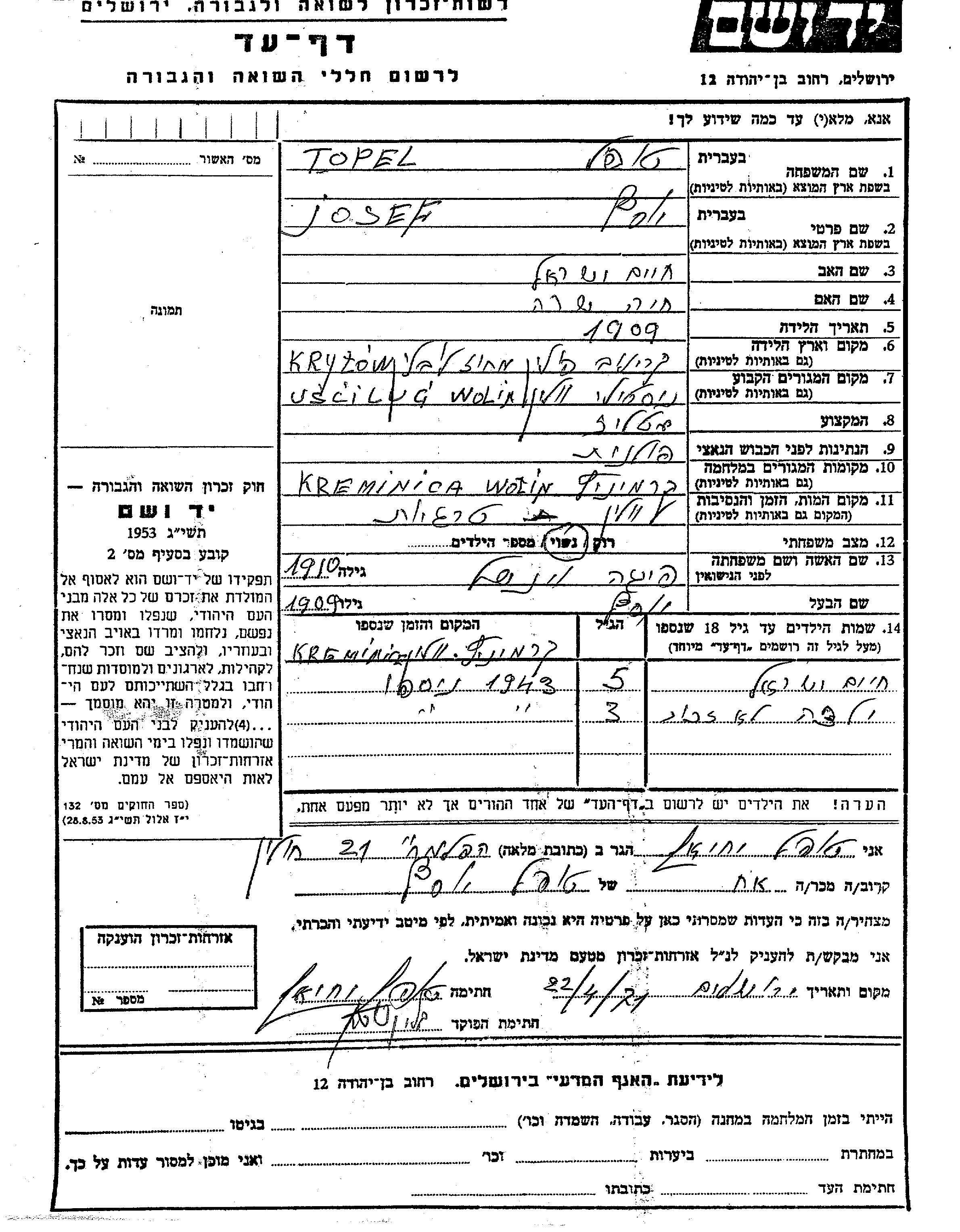 Йосеф Топель, место рождения: Крылув, Польша. Отец: Хаим Исраэль, mать:Хая Сара. Женат / замужем. Место жительства до войны: Устилуг, Польша. Место во время войны: Кременец, Польша.