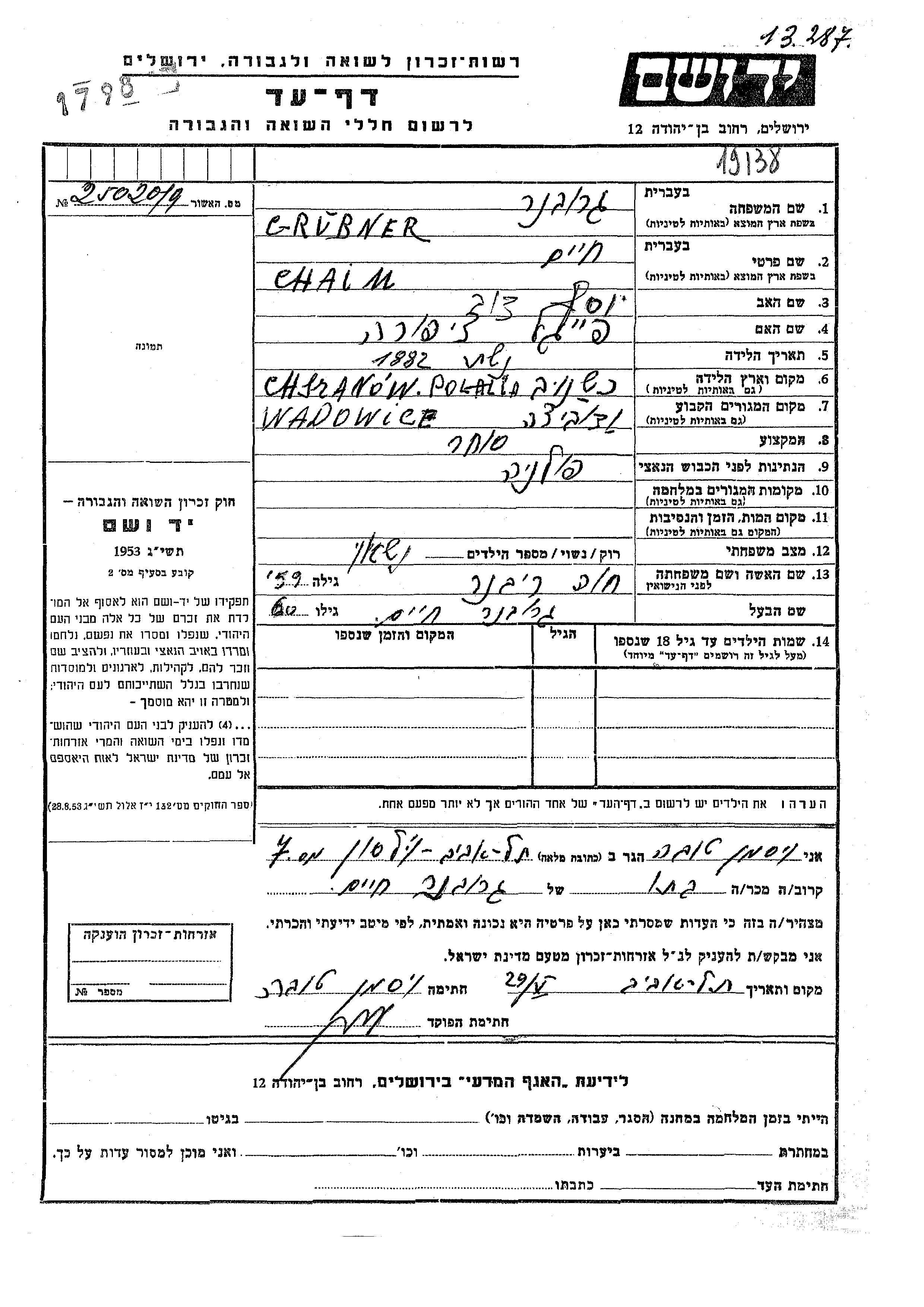 Хаим Грубнер, место рождения: Хшанув, Польша. Отец: Иосеф Дов, mать:Файгель Ципора. Торговец / торговка. Женат / замужем. Место жительства до войны: Вадовице, Польша.