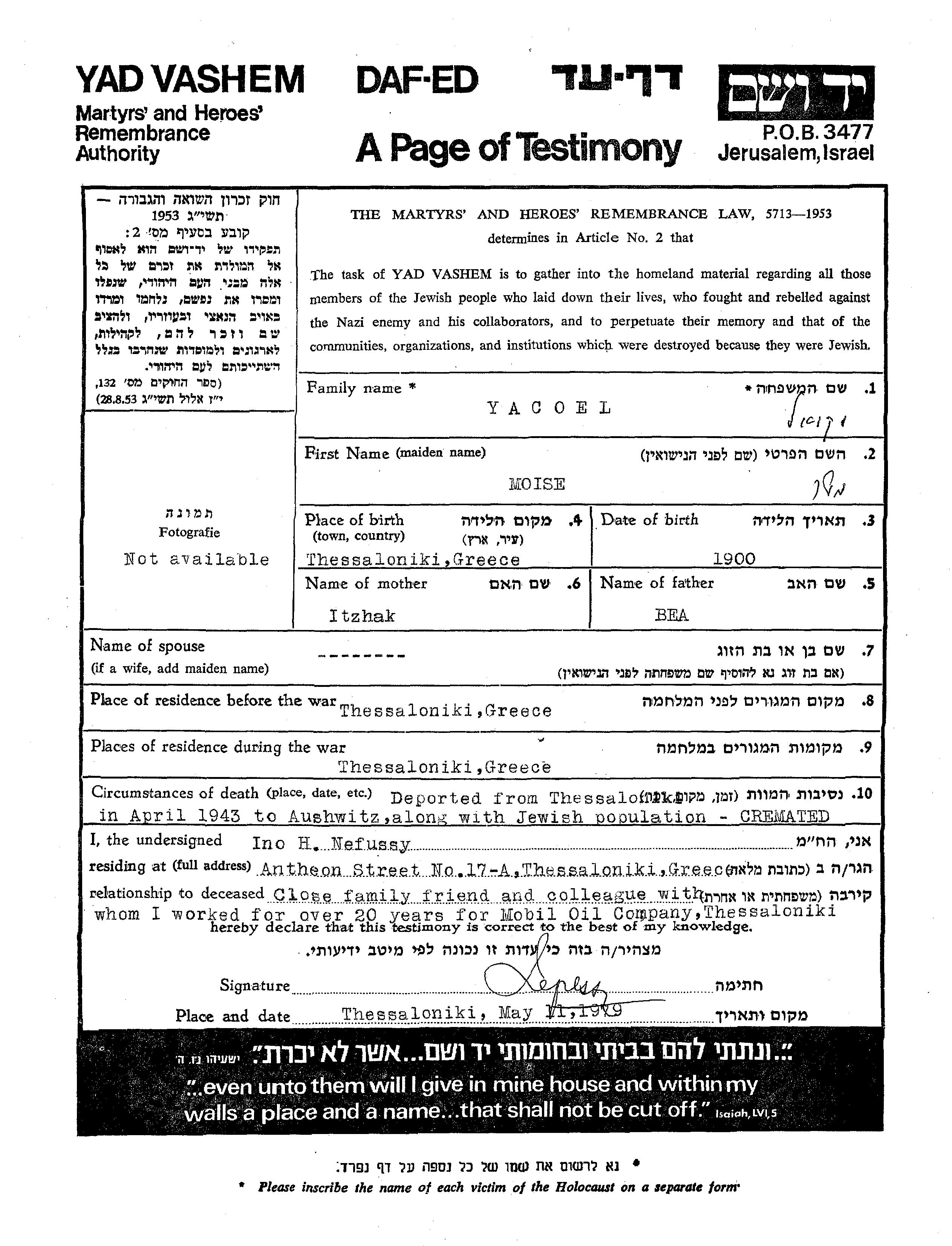 Мойсе Якоэль, место рождения: Салоники, Греция. Отец: Ицхак, mать:Беа. Место жительства до войны: Салоники, Греция. Место во время войны: Салоники, Греция.