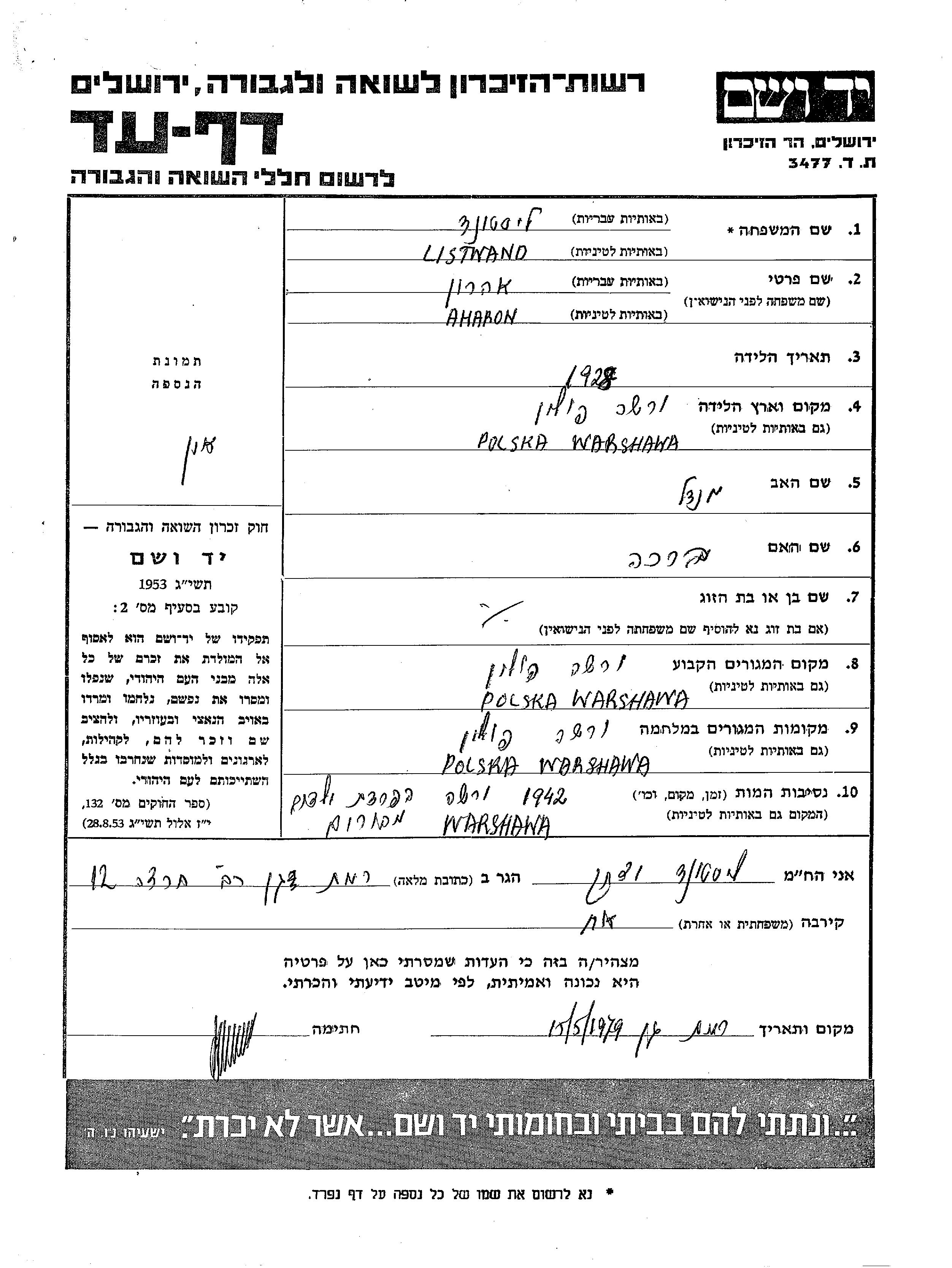 Арон Листванд, место рождения: Варшава, Польша. Отец: Мендель, mать:Браха. Место жительства до войны: Варшава, Польша. Место во время войны: Варшава, Польша.