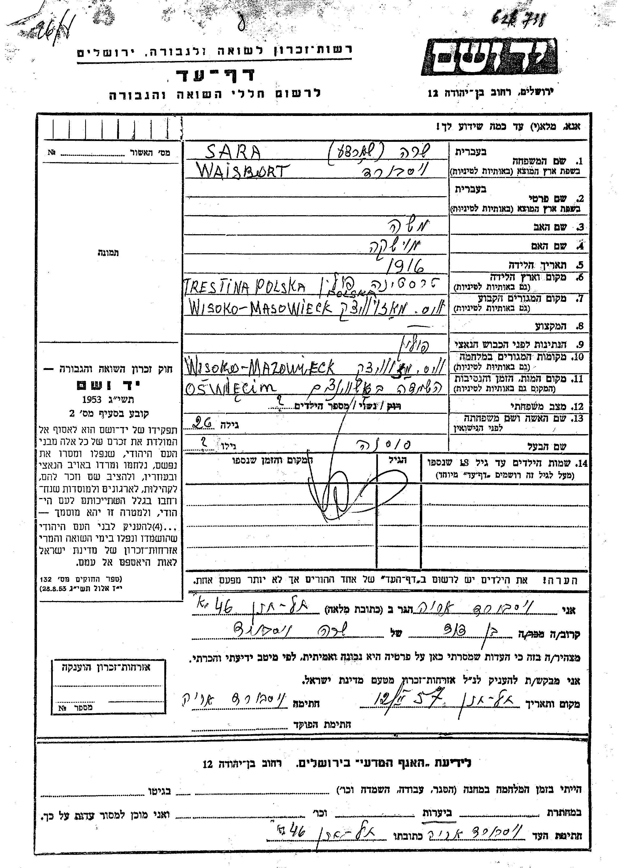 Вайсборт Сара 1916 Высоке Мазовецке, Польша Лист свидетельских показаний