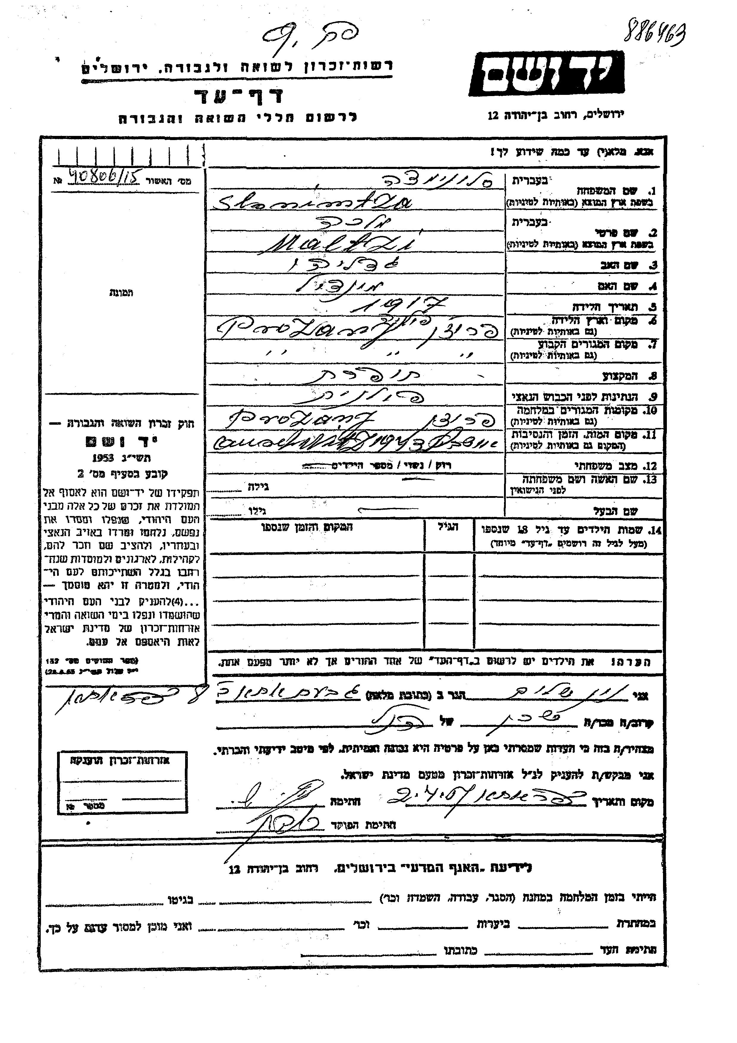 Яд Вашем - Листы свидетельских показаний Мемориального фонда