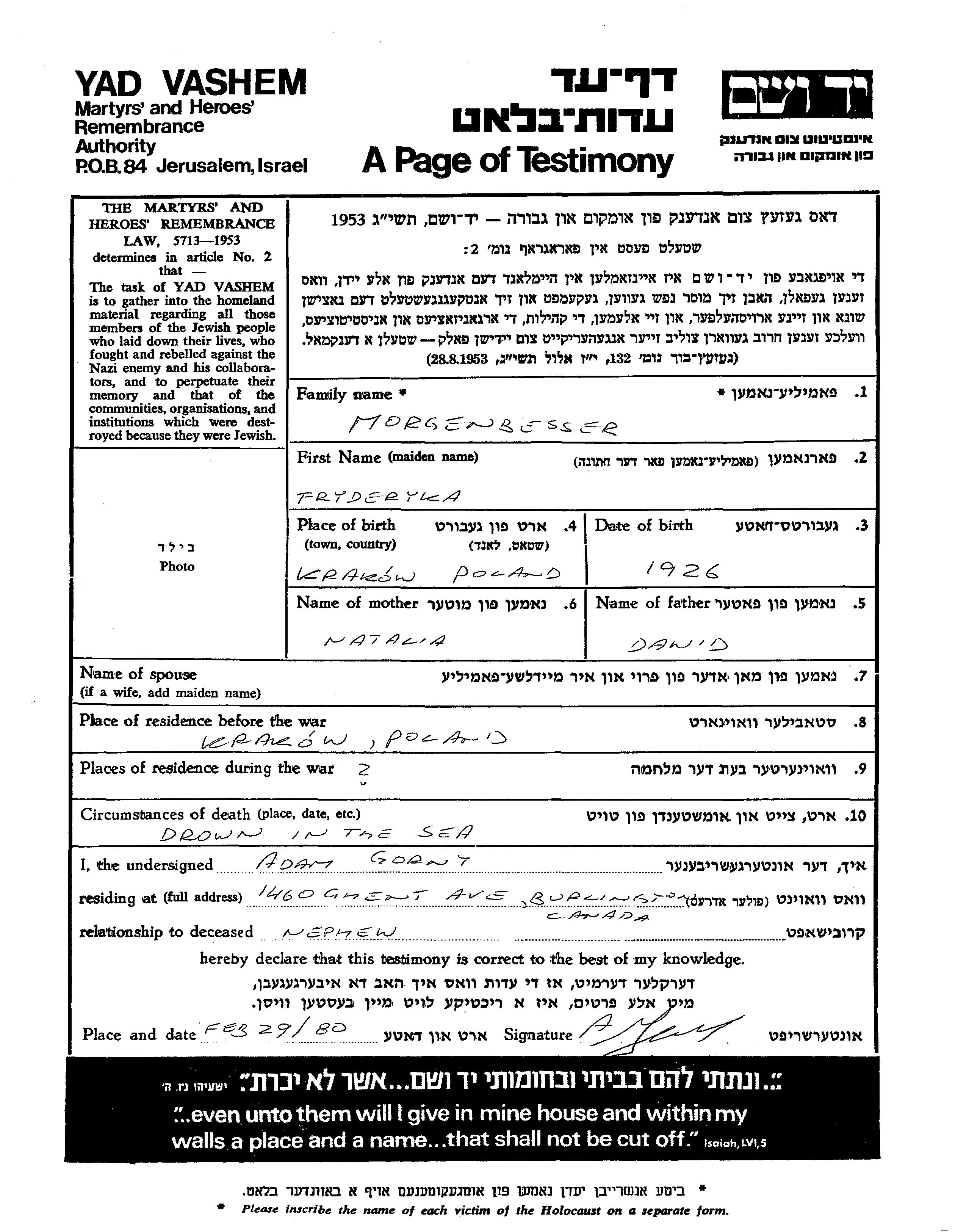 Фридерика Моргенбессер, место рождения: Краков, Польша. Отец: Давид, mать:Наталья. Место жительства до войны: Краков, Польша.