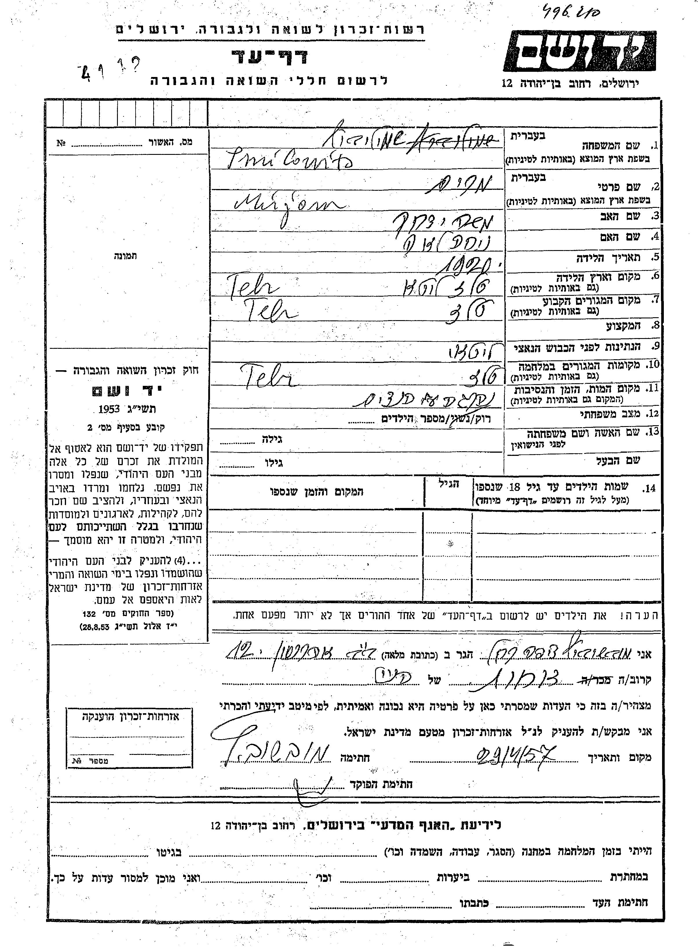 Шмилович Мирьом 1920 Тельз, Литва Лист свидетельских показаний