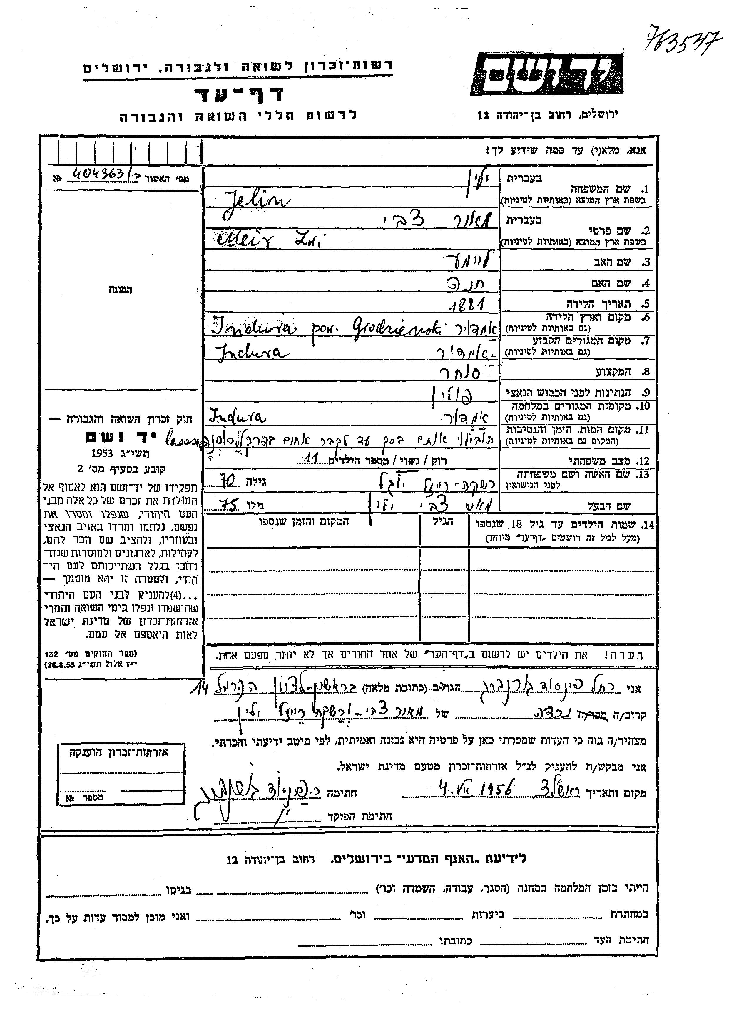 Цви Меир Елин, место рождения: Индура, Польша. Отец: Лейме, mать:Хана. Торговец / торговка. Женат / замужем. Место жительства до войны: Индура, Польша. Место во время войны: Индура, Польша.