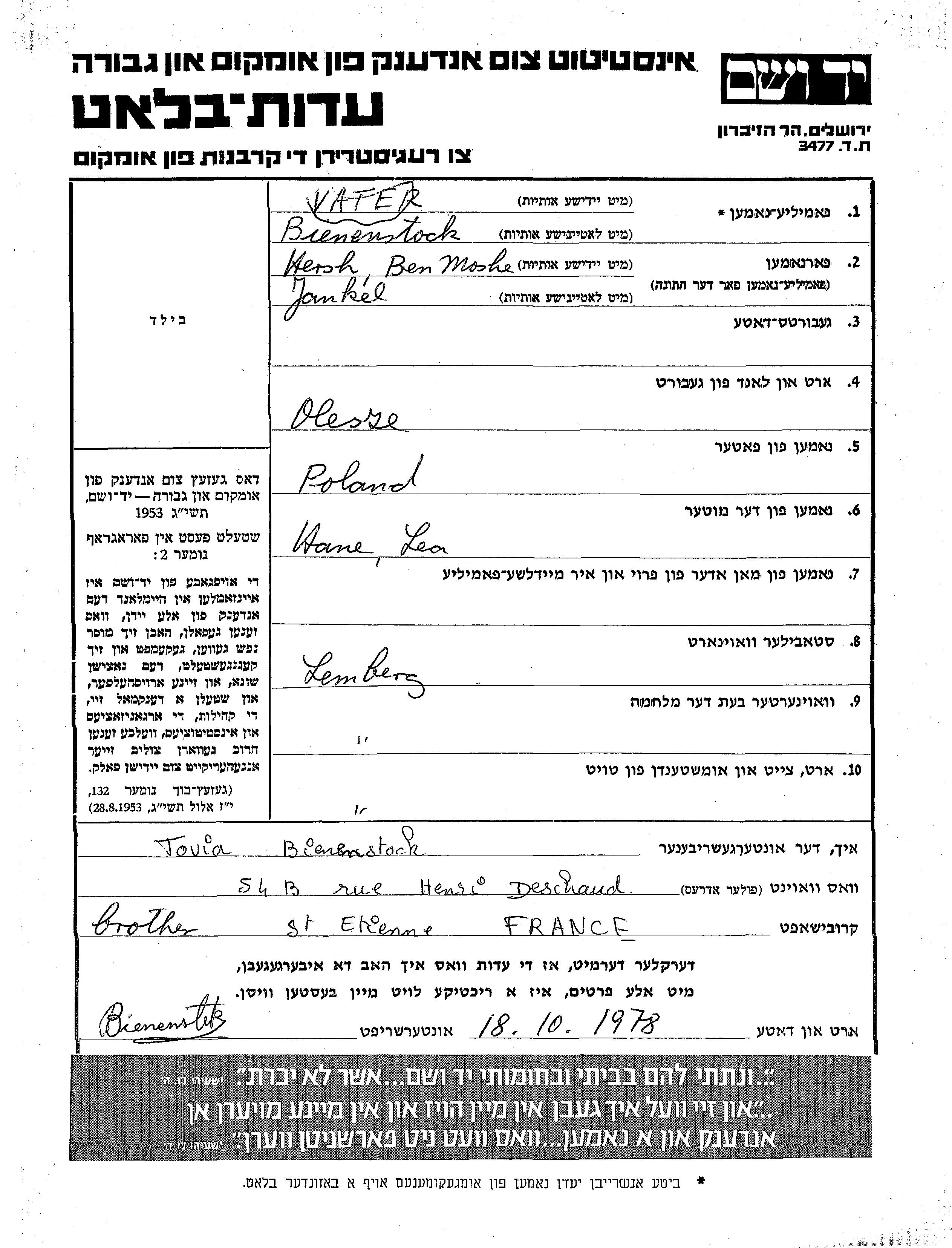 Ватер Биненшток Герш Лемберг, Польша Лист свидетельских показаний