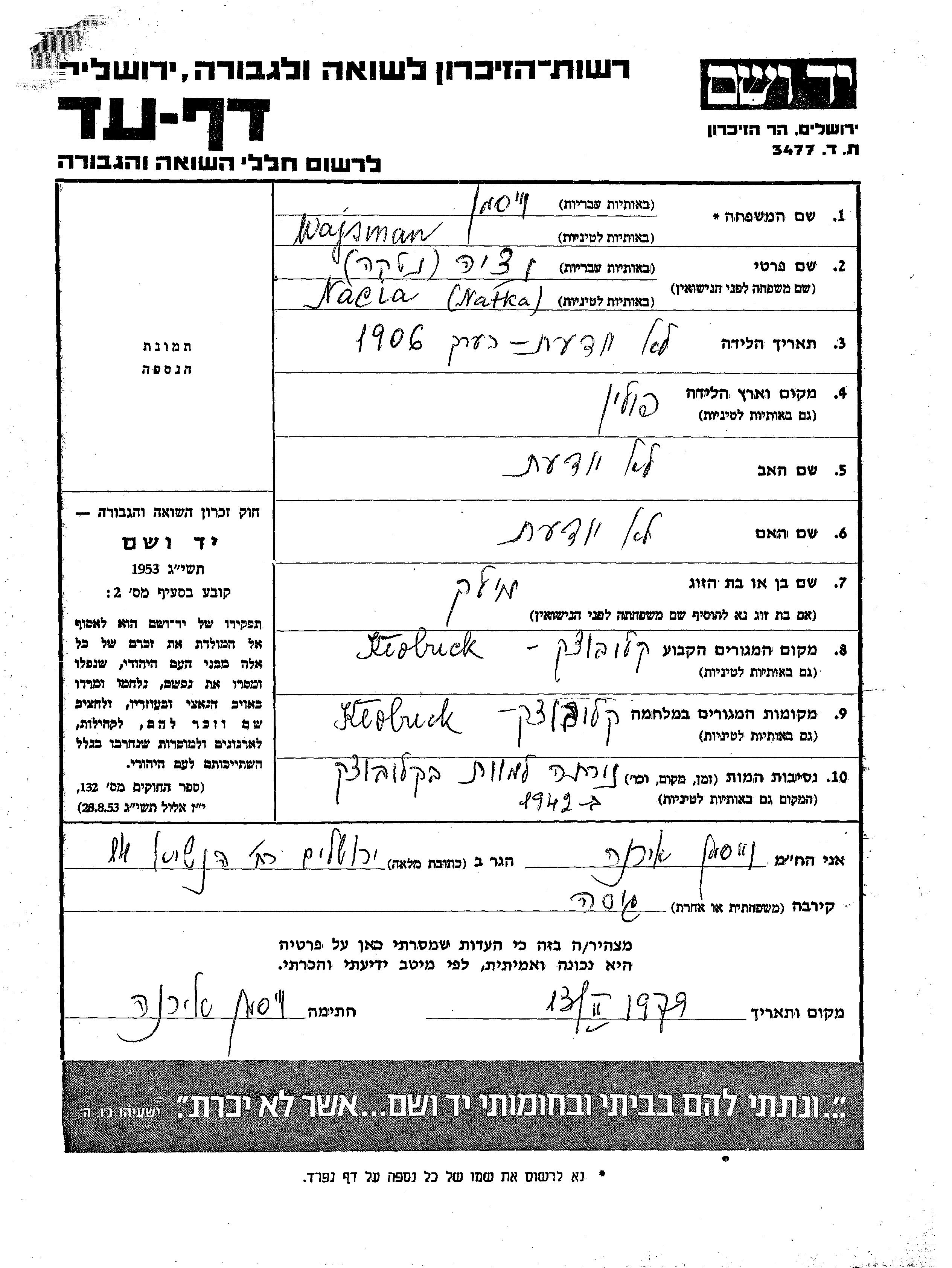 Вайсман Наця Натка Нача 1906 Клобуцк, Польша Лист свидетельских показаний