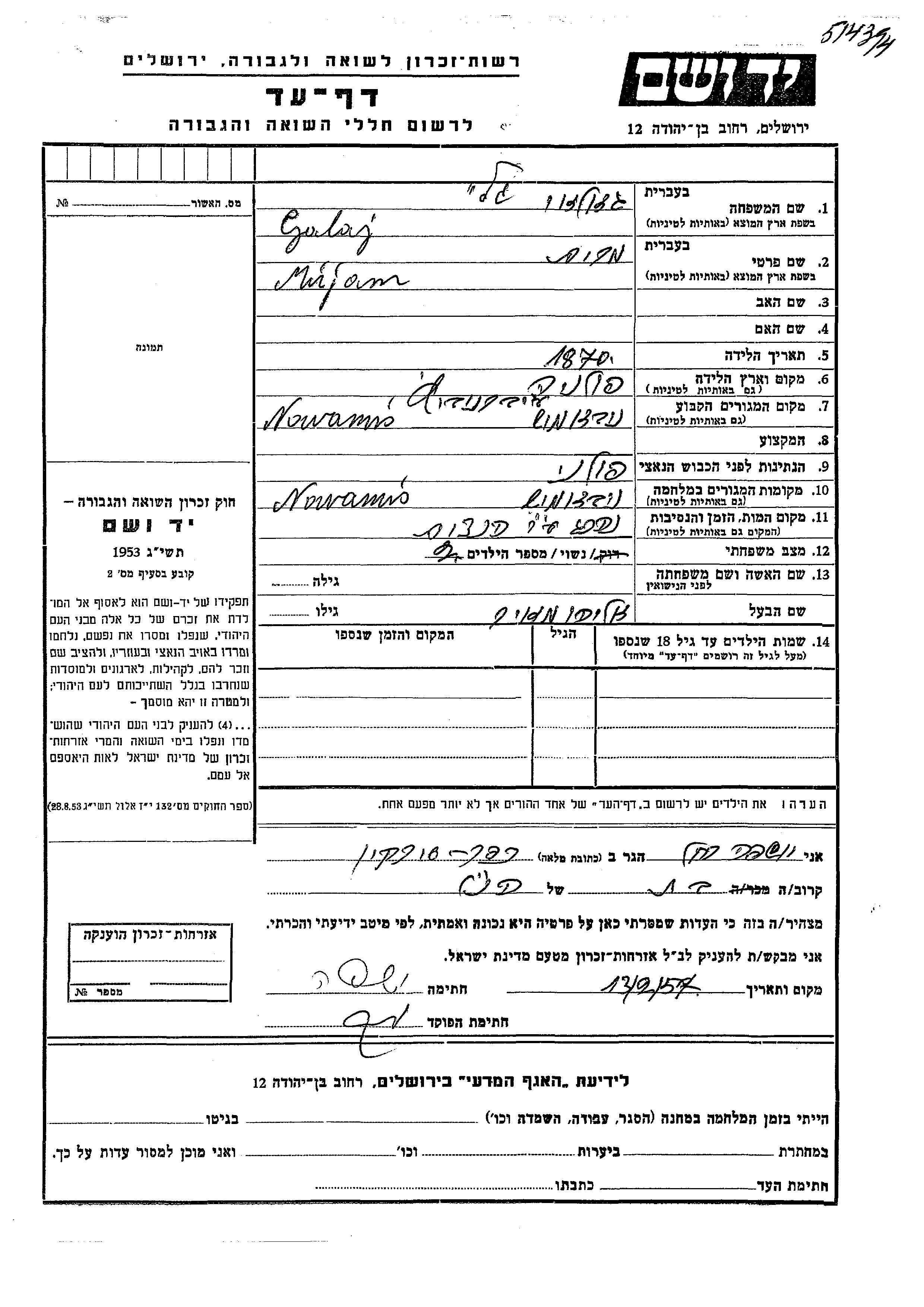 Мирьям Галай, место рождения: Польша. Женат / замужем. Место жительства до войны: Нове-Място, Польша. Место во время войны: Нове-Място, Польша.