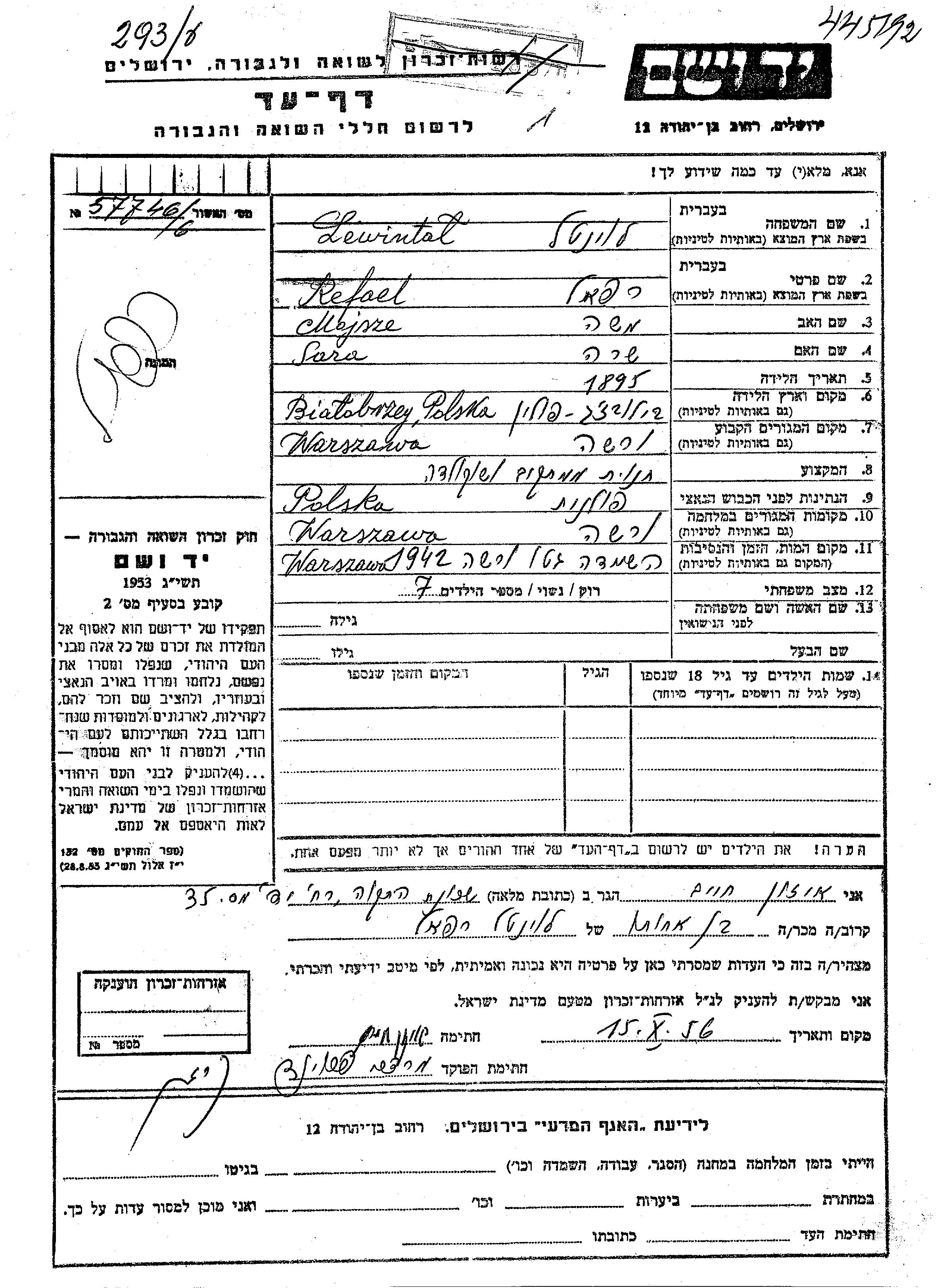 Рефаэль Левинталь, место рождения: Бялобжеги, Польша. Отец: Мойше, mать:Сара. Женат / замужем. Место жительства до войны: Варшава, Польша. Место во время войны: Варшава, Польша.