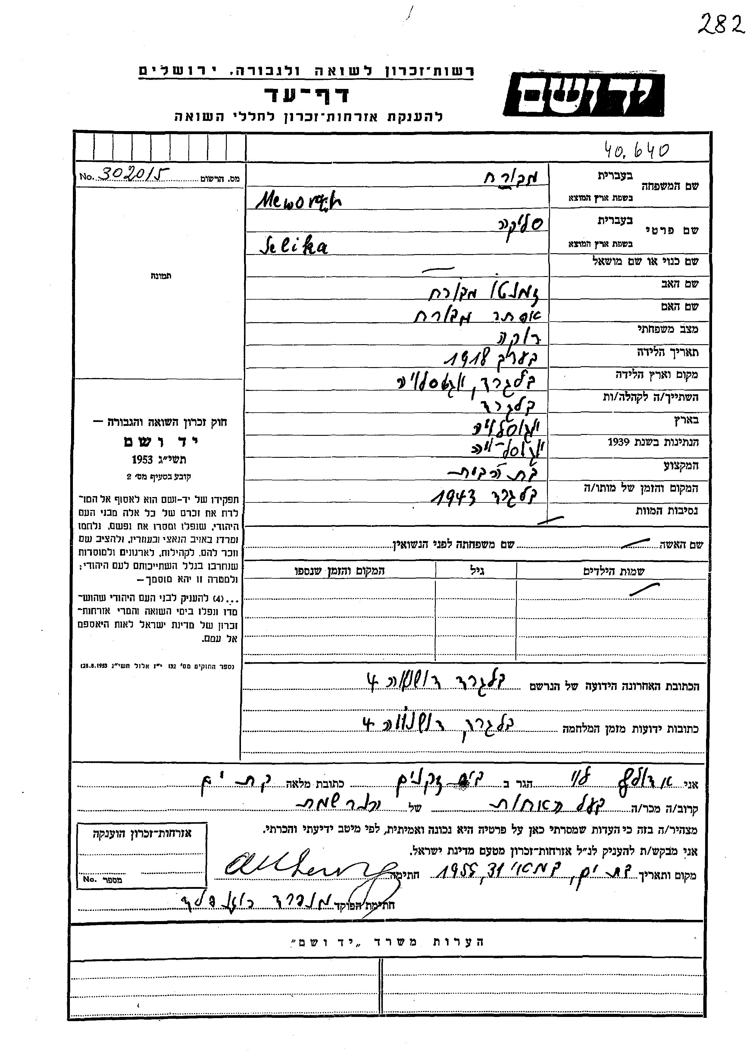 Селика Меворах, место рождения: Белград, Югославия. Отец: Земанто, mать:Эстер. Домохозяйка. Холост / не замужем. Место жительства до войны: Белград, Югославия. Место во время войны: Белград, Югославия.