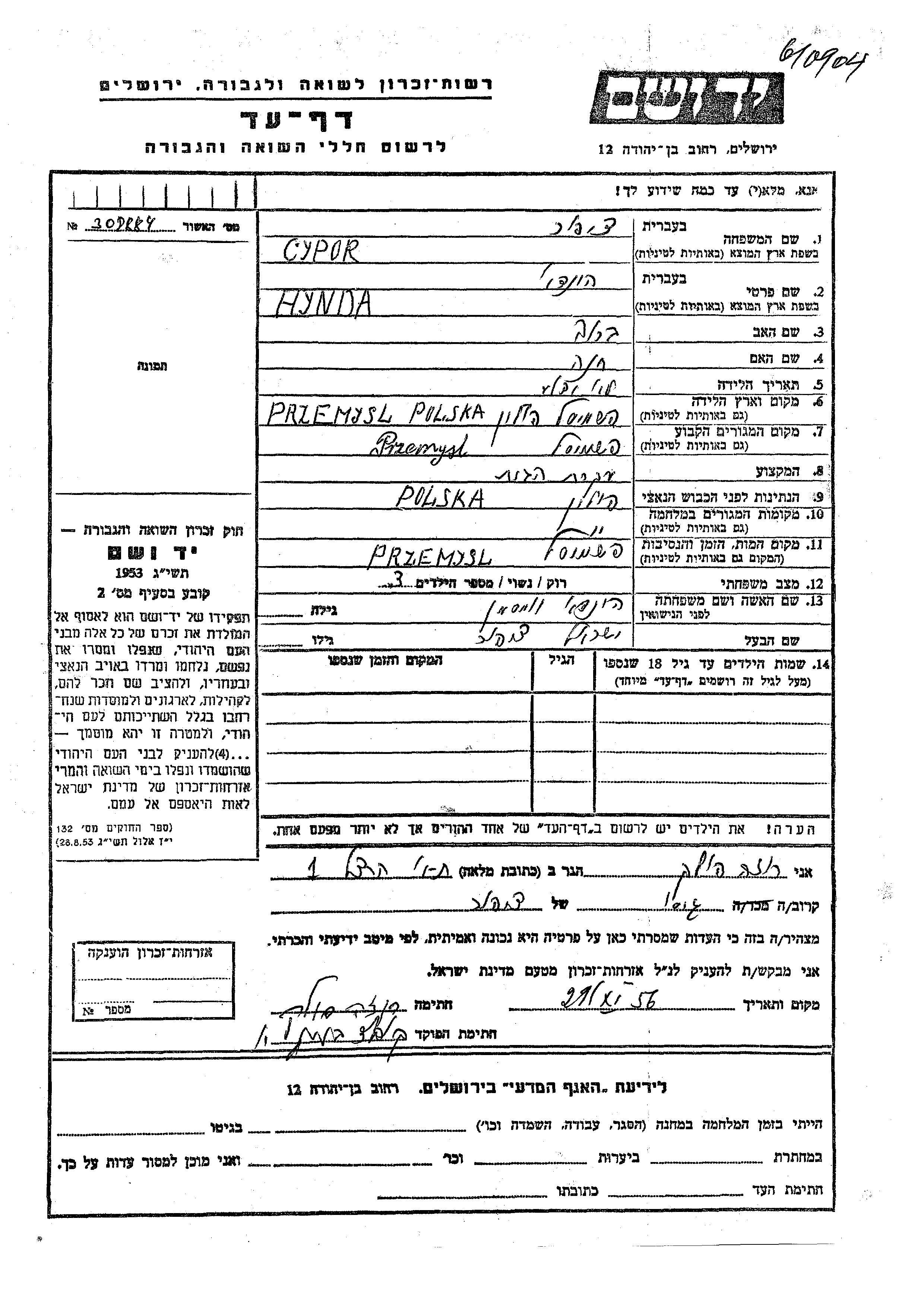 Хинда Цыпор, девичья фамилия Вейсман, место рождения: Пшемысль, Польша. Отец: Барух, mать:Хана. Домохозяйка. Женат / замужем. Место жительства до войны: Пшемысль, Польша. Место во время войны: Польша.