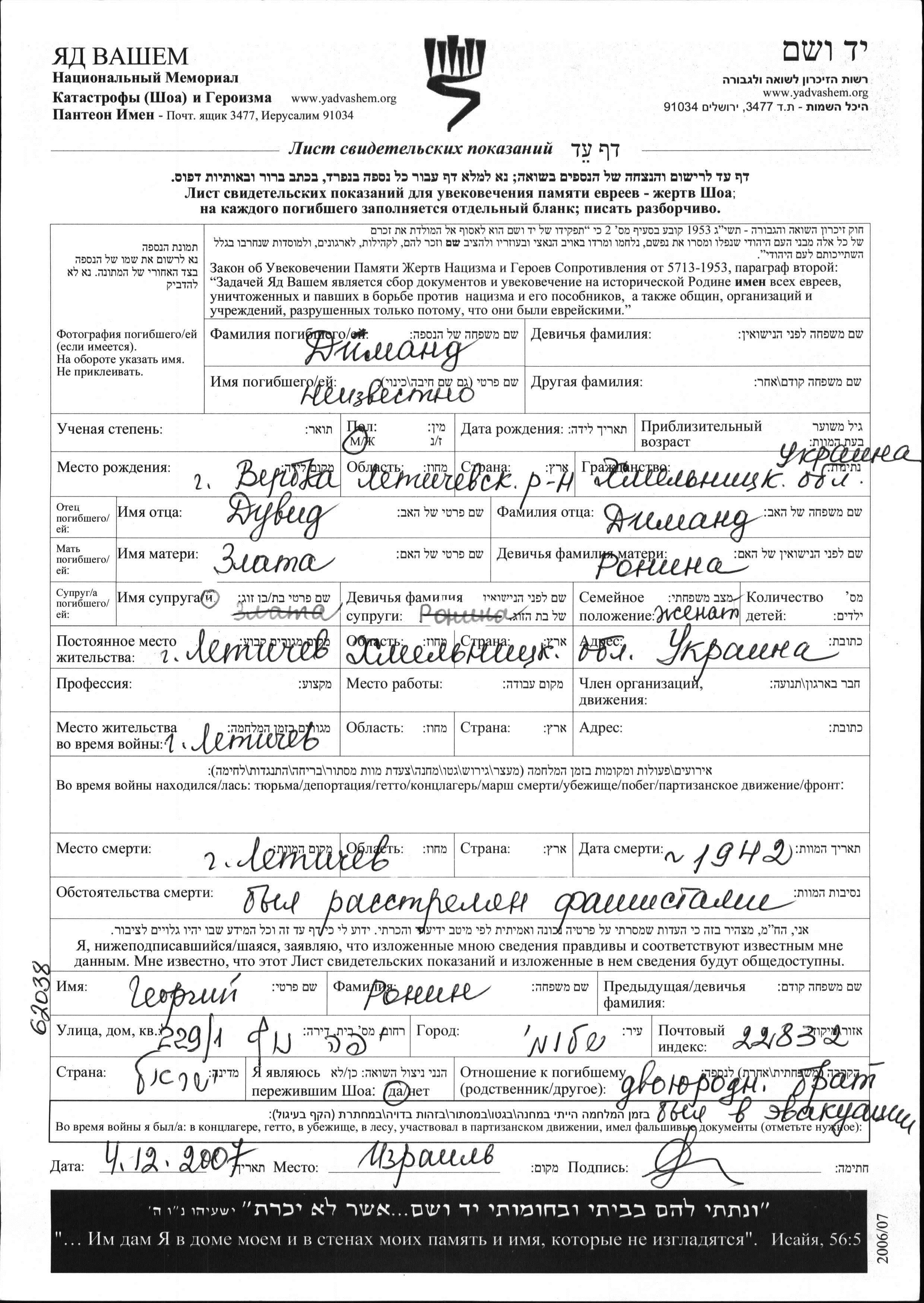 Яд Вашем - Листы свидетельских показаний Мемориального фонда