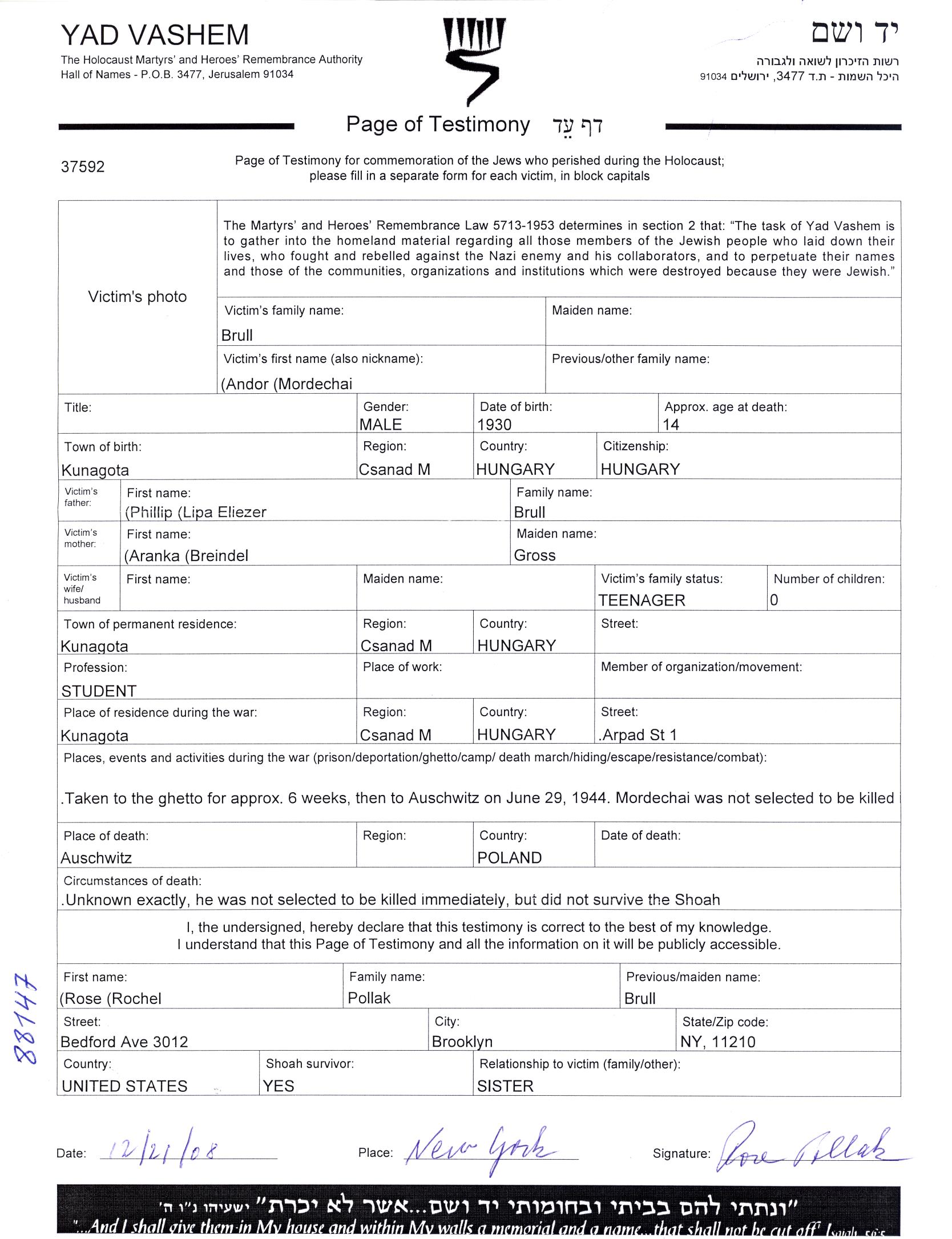 Андор Мордехай Брулль, место рождения: Кунагота, Венгрия. Отец: Филлип Липа Элиэзер, mать:Брейндел Аранка, девичья фамилия Гросс. Ученик. Подросток. Место жительства до войны: Кунагота, Венгрия. Место во время войны: ГЕТТО.