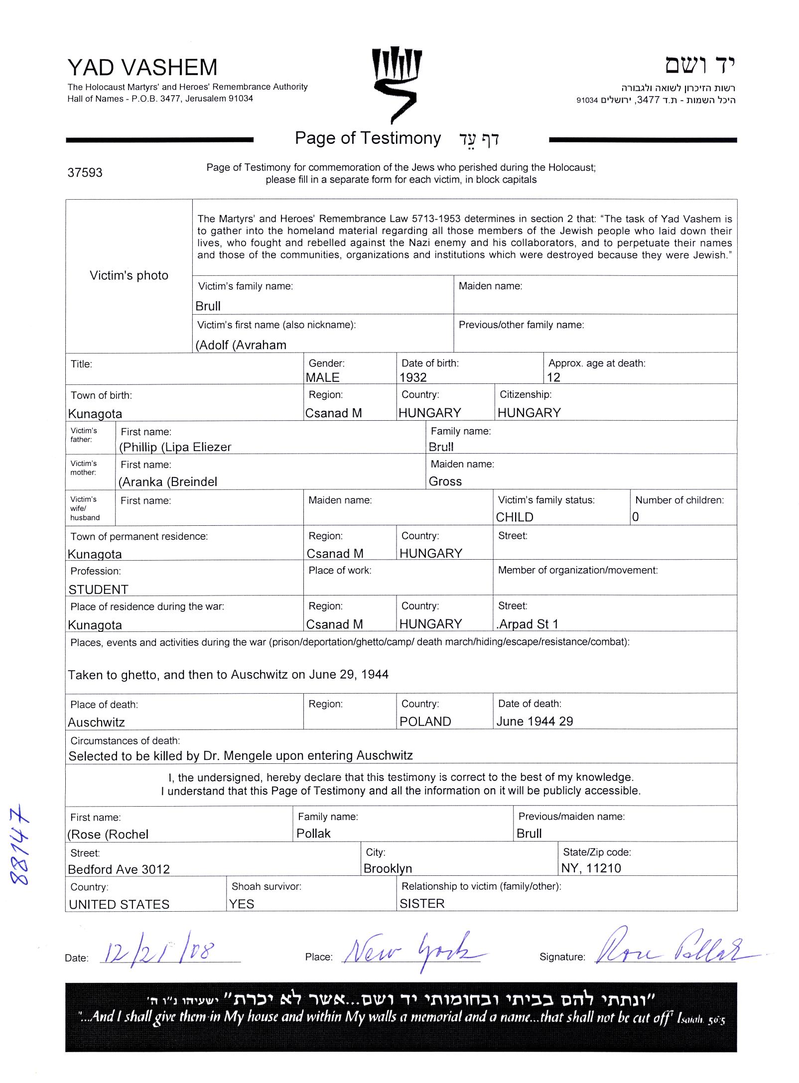 Адольф Авраам Брулль, место рождения: Кунагота, Венгрия. Отец: Филлип Липа Элиэзер, mать:Аранка Брейндел, девичья фамилия Гросс. Ученик. Ребенок. Место жительства до войны: Кунагота, Венгрия. Место во время войны: ГЕТТО.