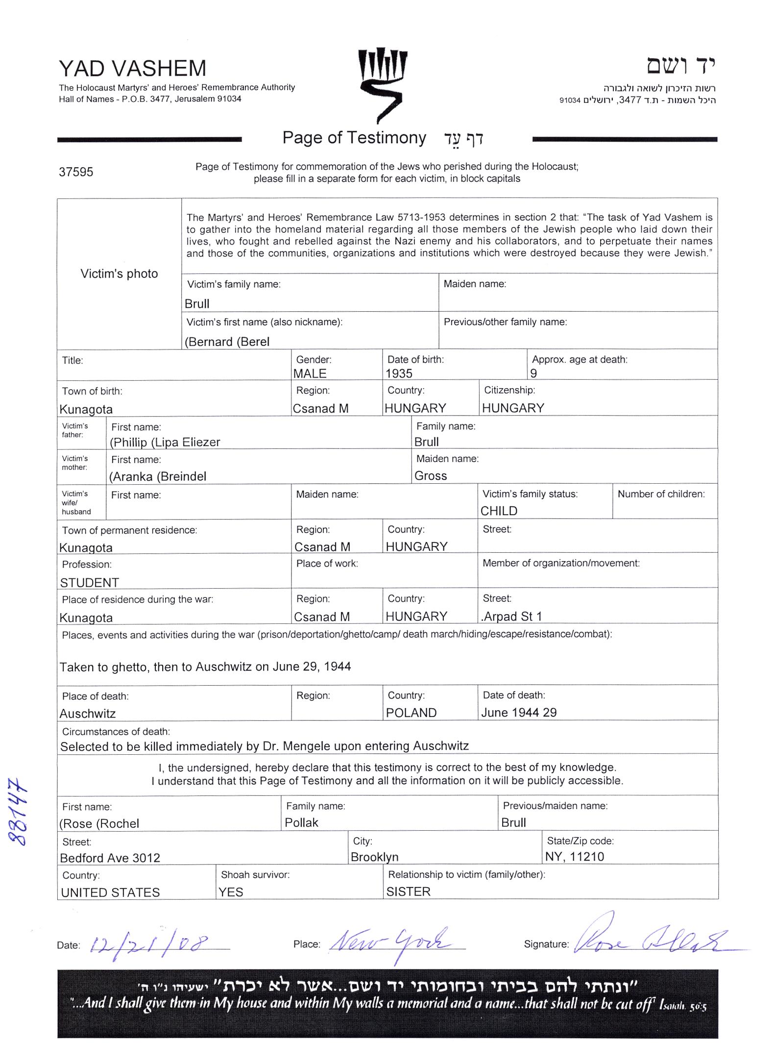 Бернард Берел Брулль, место рождения: Кунагота, Венгрия. Отец: Филлип Липа Элиэзер, mать:Аранка Брейндел, девичья фамилия Гросс. Ученик. Ребенок. Место жительства до войны: Кунагота, Венгрия. Место во время войны: ГЕТТО.