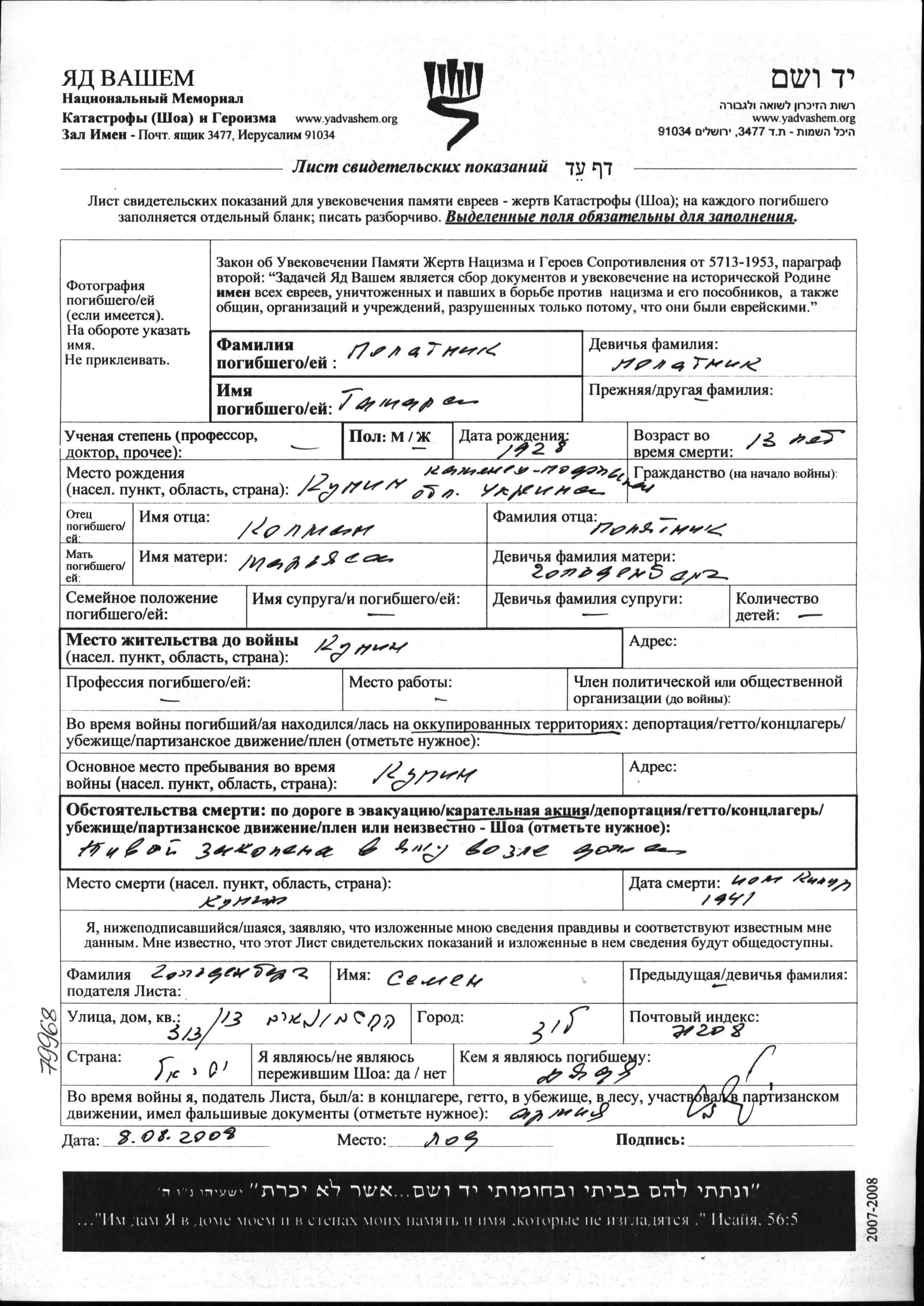 Полатник Тамара 1928 Kupin, Украина (СССР) Лист свидетельских показаний