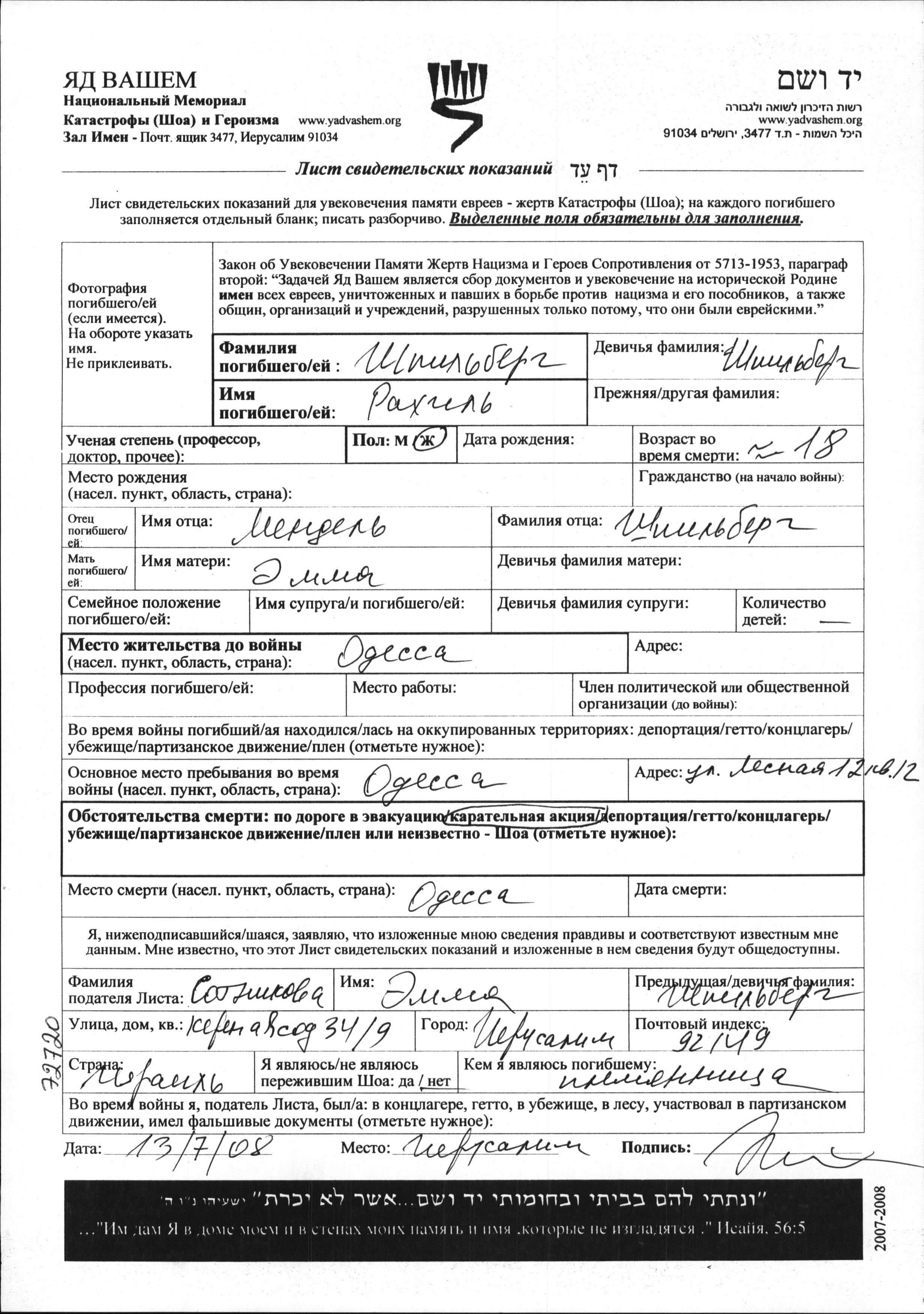 Шпильберг Рахиль Одесса, Украина (СССР) Лист свидетельских показаний