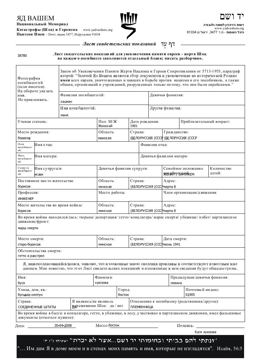 Кацман Маня 1901 Борисов, Белоруссия (СССР) Лист свидетельских показаний (электронный)