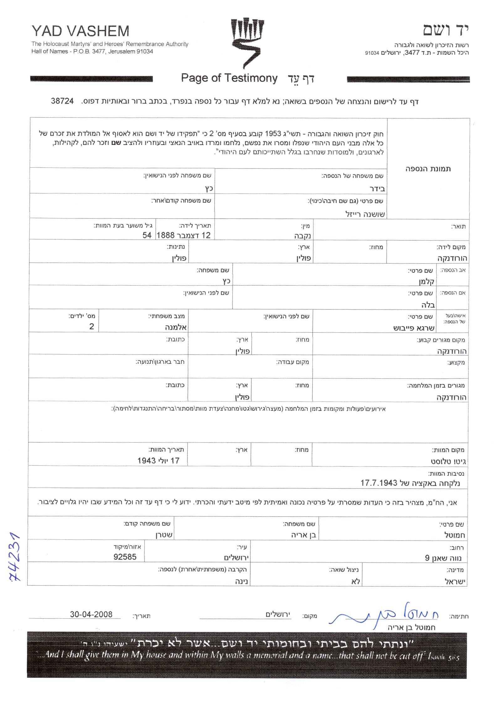 Шошана Рейзл Бидер, девичья фамилия Кац, место рождения: Городенка, Польша. Отец: Кальман, mать:Бела. Вдова. Место жительства до войны: Городенка, Польша. Место во время войны: Городенка, Польша. Шошана Рейзл уничтоженa в период Шоа. место смерти: Тлусте, Польша в 17/07/1943.