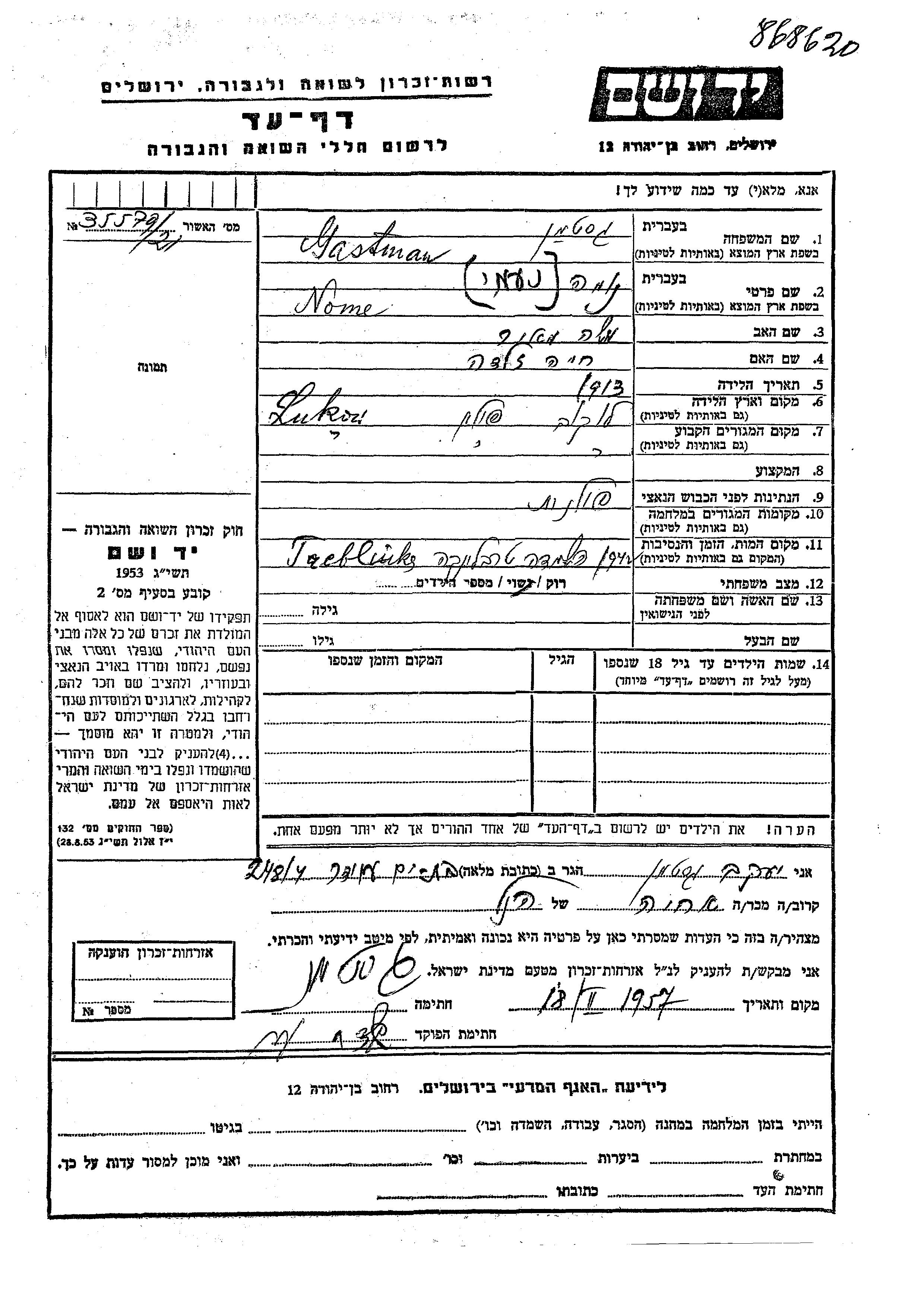 Номе Гастман, место рождения: Лукув, Польша. Отец: Моше Меир, mать:Хая Зельда. Холост / не замужем. Место жительства до войны: Лукув, Польша.