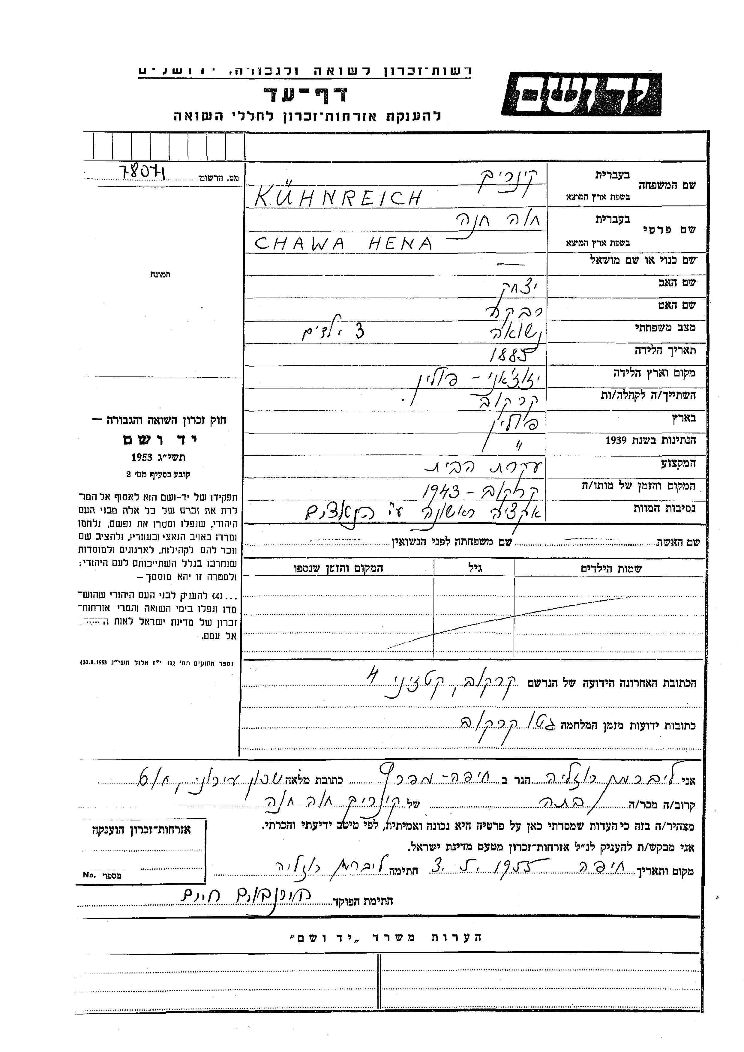 Хава Хена Кюнрайх, место рождения: Озеряны, Польша. Отец: Ицхак, mать:Ривка. Домохозяйка. Женат / замужем. Место жительства до войны: Краков, Польша. Место во время войны: Краков, Польша.