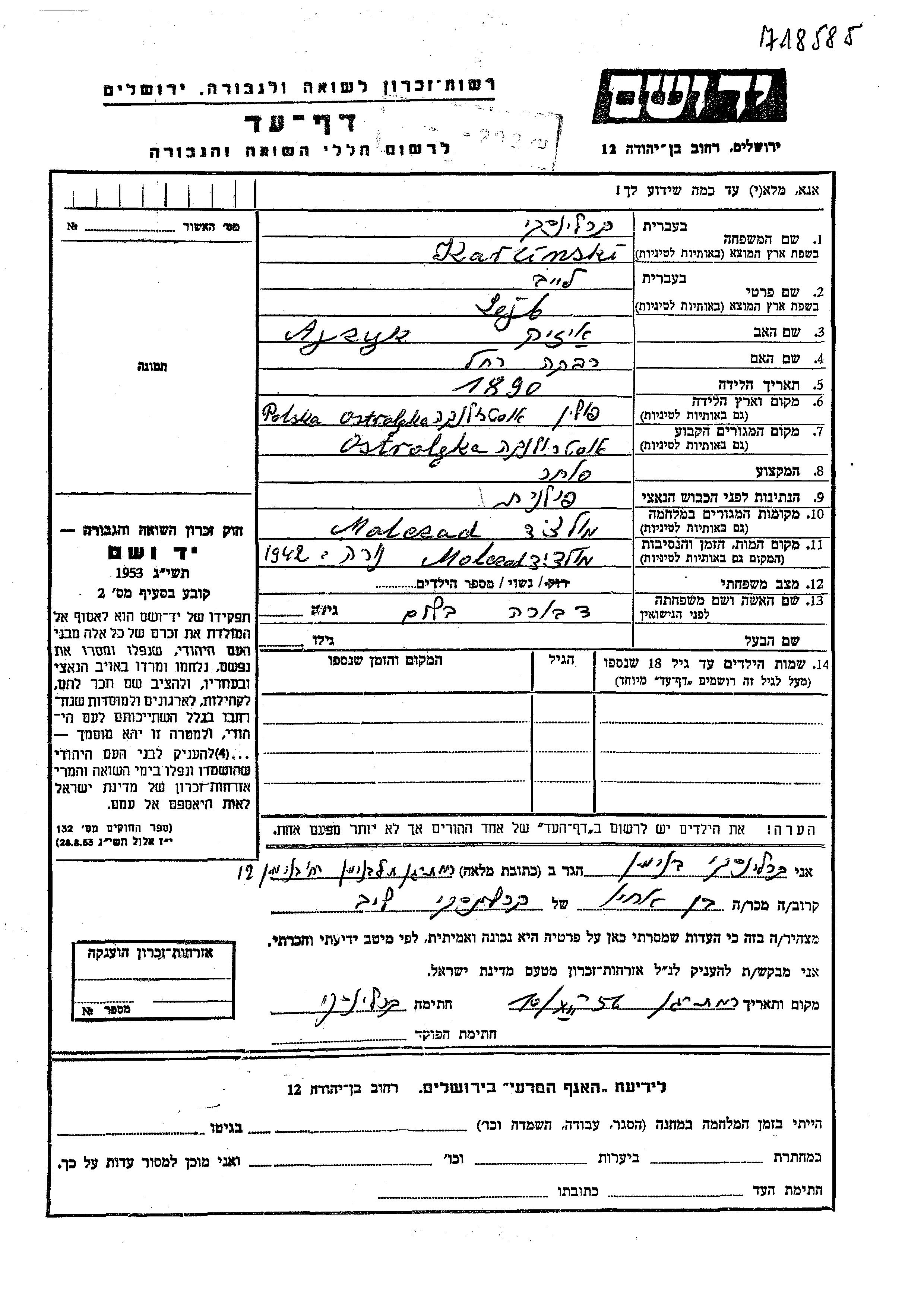 Лейб Карлински, место рождения: Остроленка, Польша. Отец: Айзик, mать:Ривка Рахель. Торговец / торговка. Женат / замужем. Место жительства до войны: Остроленка, Польша. Место во время войны: Молчадь, Польша.