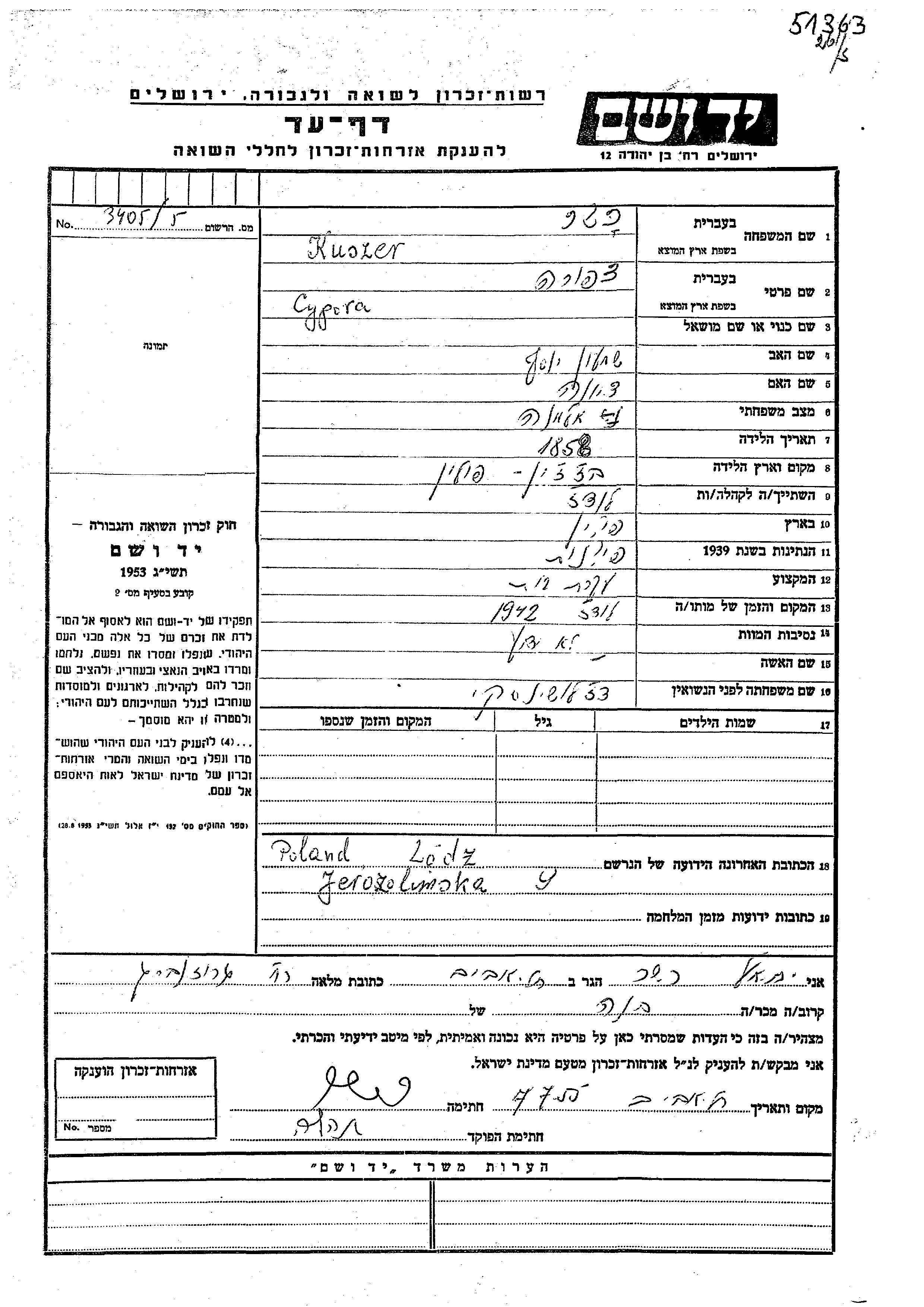 Ципора Кушер, девичья фамилия Дзалошински, место рождения: Бжезины, Польша. Отец: Шимон Иосеф, mать:Циона. Домохозяйка. Место жительства до войны: Лодзь, Польша. Место во время войны: Лодзь, Польша.